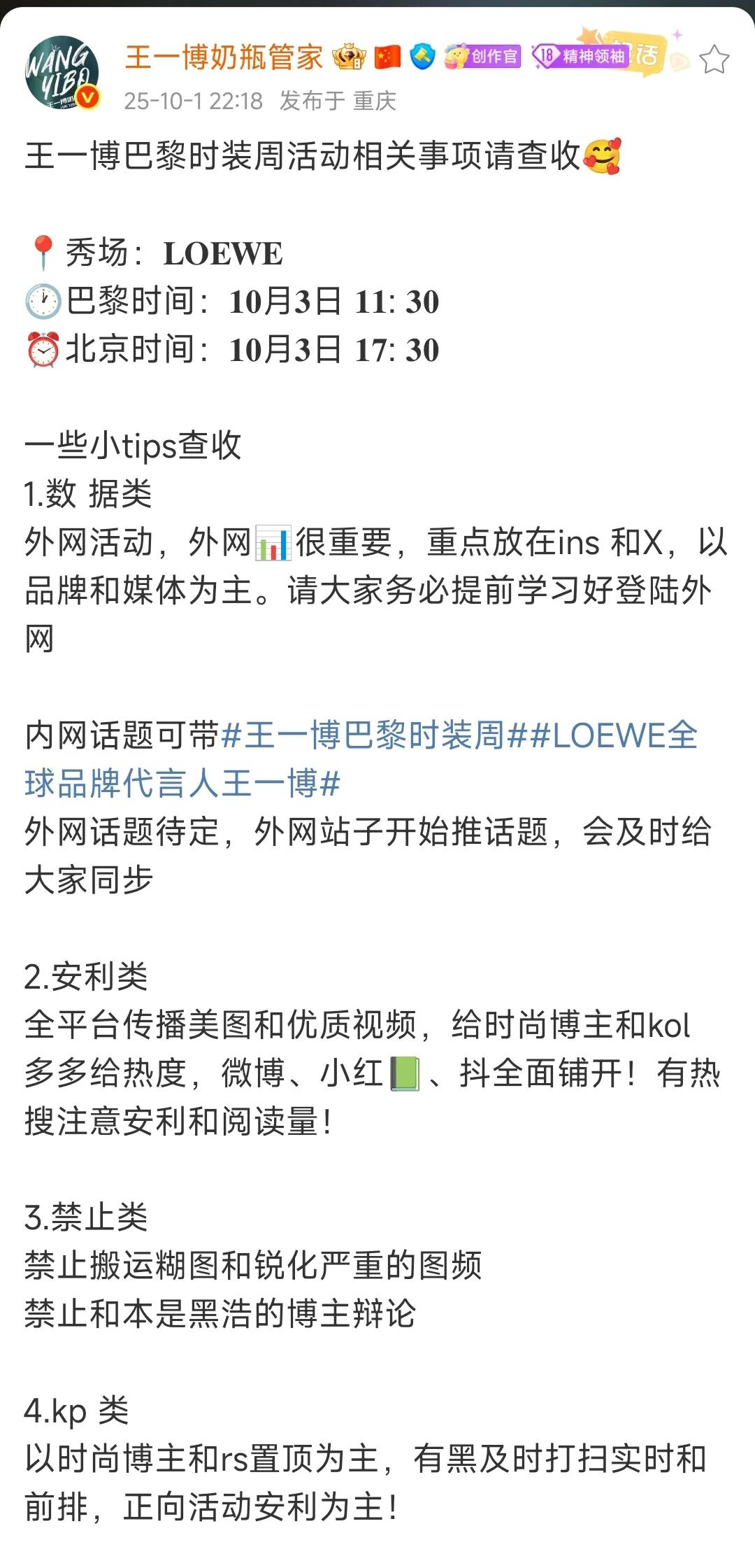 LOEWE罗意威明日大秀,摩托姐姐准备好了追星吗?✌🏻✌🏻✌🏻 因为上海赛车行程冲突,所以今年巴黎时装周王一博只出席罗意威一场,时装周期间摩托重点做什么、注意事项,看p3👇🏻,奶瓶跟着走。 还有谁没去p2预约?[大金牙] 王一博