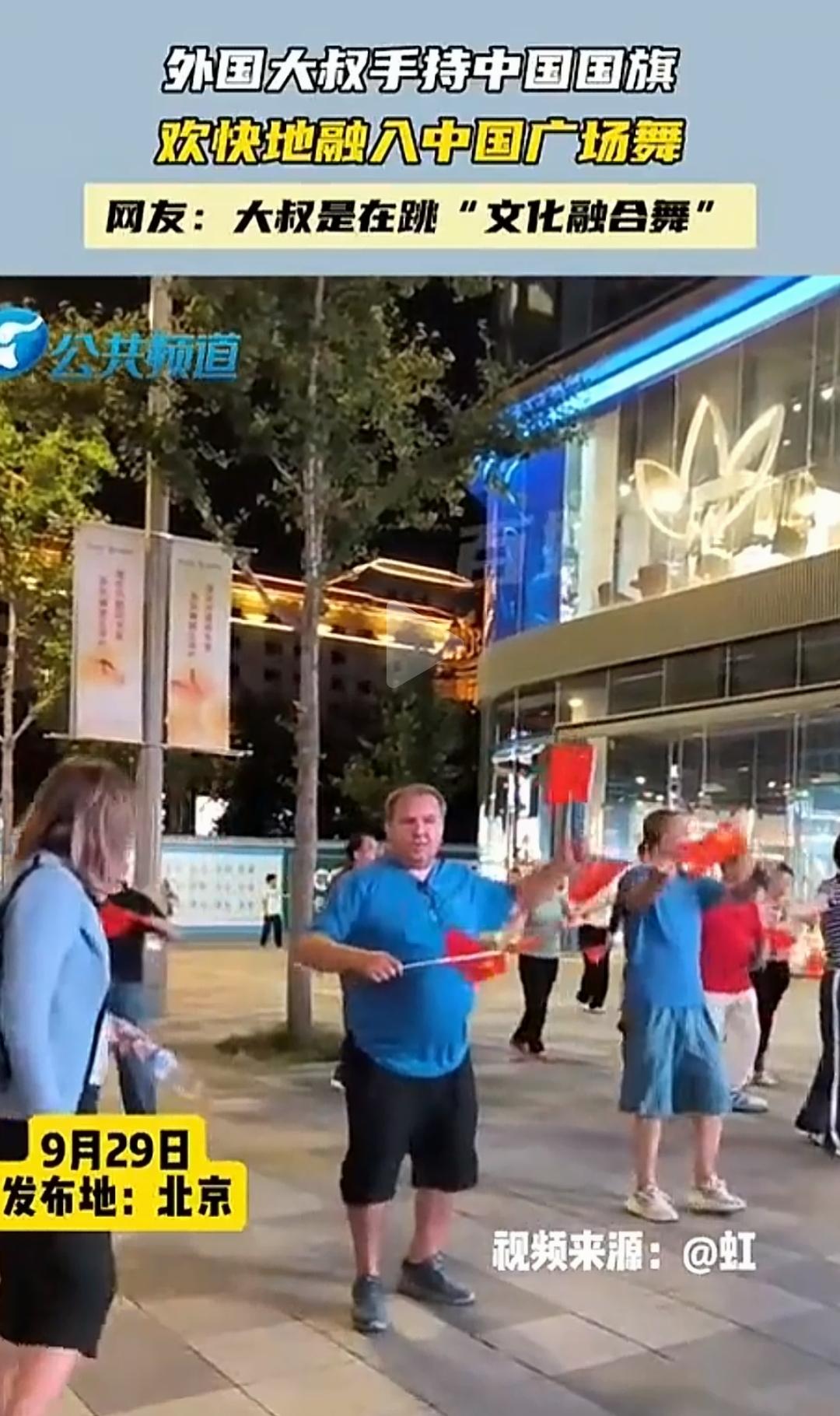 老外拿着中国国旗和大妈们跳广场舞,玩得不亦乐乎。嗯,直到他老婆来了……[笑哭][