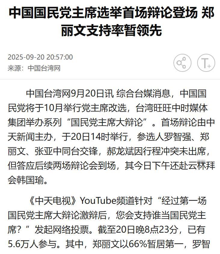 国民党主席选举的热度骤然爆炸。就在各方高手你来我往的时候,一份网络或民间票选民调冒出来,竟让“她”——郑丽文,荣登榜首。谁也没想到,本被许多人视为政治老将、派系宠儿的郝龙斌,反倒在这波“意外民调风暴”下变成了助攻者。   谁也没料到,一份网络民调的出炉,直接把选情掀了个底朝天。   中天新闻主办的首场辩论结束后,平台发起的投票吸引了5.6万人参与。截至当晚八点多,郑丽文以66%的支持率一骑绝尘,把18%的罗智强和10%的张亚中远远甩在身后,郝龙斌更是只拿到5%的票数排在末位。更惊人的是另一份投票数超14万的网络调查,她的支持率直接冲到59%,是第二名18%的三倍还多。   这股“郑丽文旋风”刮得太突然,连蓝营的党公职们都始料未及。   他们原本盯着的是郝龙斌的派系动作,琢磨着张亚中的深蓝基本盘,没把这位前“立委”当成最大变量。直到基层党员的热情涌上来,大家才发现,郑丽文早已悄悄抓住了最迫切的需求。   东吴大学的张元祥教授提到一个细节。一位北部的国民党区域民代上周和郑丽文同台参加退伍军人活动,彻底被她的表现惊到。台上的郑丽文口才利落,痛批赖清德的言论句句戳中人心,台下百位年过七旬的退伍老将听得入迷,散场后像追偶像似的围上去合影。   这场景藏着她逆袭的关键密码。蓝营基层早憋着一股气,他们受够了老面孔轮流坐庄的“政治大风吹”,更急需一个能正面硬刚民进党的狠角色。郑丽文的出现,恰好填补了这份期待。她的论述清晰有力,煽动力又强,完全符合党员们对“抗绿领军人”的想象。   郝龙斌的被动,恰恰反衬了这种需求的迫切。   他不是没实力,只是身上的“旧标签”太明显。选民看惯了他这类党务高层的运作模式,在求变的情绪浪潮里,反而显得保守又滞后。更巧的是,他还错过了首场关键辩论,理由是行程冲突,只能答应后续场次出席,而当天下午他还在云林拜会韩国瑜。   这波操作让不少党员觉得他不够重视,对比郑丽文在辩论场上的锋芒毕露,差距一下就拉开了。   郑丽文的优势还在持续发酵。她的眷村子弟身份,帮她稳稳抓住了黄复兴党部的支持。原本张亚中靠着深蓝立场收割这部分选票,现在选票明显向郑丽文集中,这让她的基本盘瞬间扎实起来。   更妙的是她的“中壮派”定位。和罗智强一样,郑丽文一直喊着“中生代接班”的口号,这戳中了内渴望革新的痛点。有分析指出,要是两人能达成结盟默契,比如一人当选后另一人出任副主席,巩固中壮派话语权,胜算还能再涨一截。   这种可能性让选情更添变数,也让郝龙斌的“派系牌”显得没那么管用了。   不过老政治人都清楚,现在的民调狂欢还得打个折扣。2021年党主席选举时,张亚中也曾在党员民调里领先,最后还是输给了朱立伦,关键就在于激情退去后,理性选票会回流到更稳健的候选人身上。郑丽文能不能把这股旋风维持到最后,还是个未知数。   但即便如此,她的逆袭已经改写了选举的底层逻辑。郝龙斌原本的“称霸剧本”彻底失效,反倒成了衬托变革需求的“背景板”。那些原本押注郝龙斌的派系,现在也开始重新评估“郑主席”的可能性。   这场反转里藏着最真实的政治现实:不管资历多深、派系多硬,抓不住基层的情绪脉搏,照样会被甩在身后。郑丽文的崛起不是偶然,她踩准的是蓝营对“抗绿无力”的焦虑,是对“旧格局”的厌倦,更是对“新希望”的渴求。   郝龙斌的失势也不是意外,他代表的传统路径,在求变的浪潮面前,终究显得力不从心。现在的国民党主席选举,早已不是派系之间的利益分账,而是一场“守旧”与“革新”的正面较量。   郑丽文能不能笑到最后不好说,但她已经用这场逆袭证明:政治舞台上,从来没有稳赢的剧本,只有读懂人心的赢家。郝龙斌的“助攻”更像一面镜子,照出了百年老党最迫切的自我革新需求——比起熟悉的老面孔,大家更想要能打胜仗的新领航人。   官方信源:中国台湾网. (2025-09-20). 国民党主席选举首场辩论登场 郑丽文支持率暂领先.