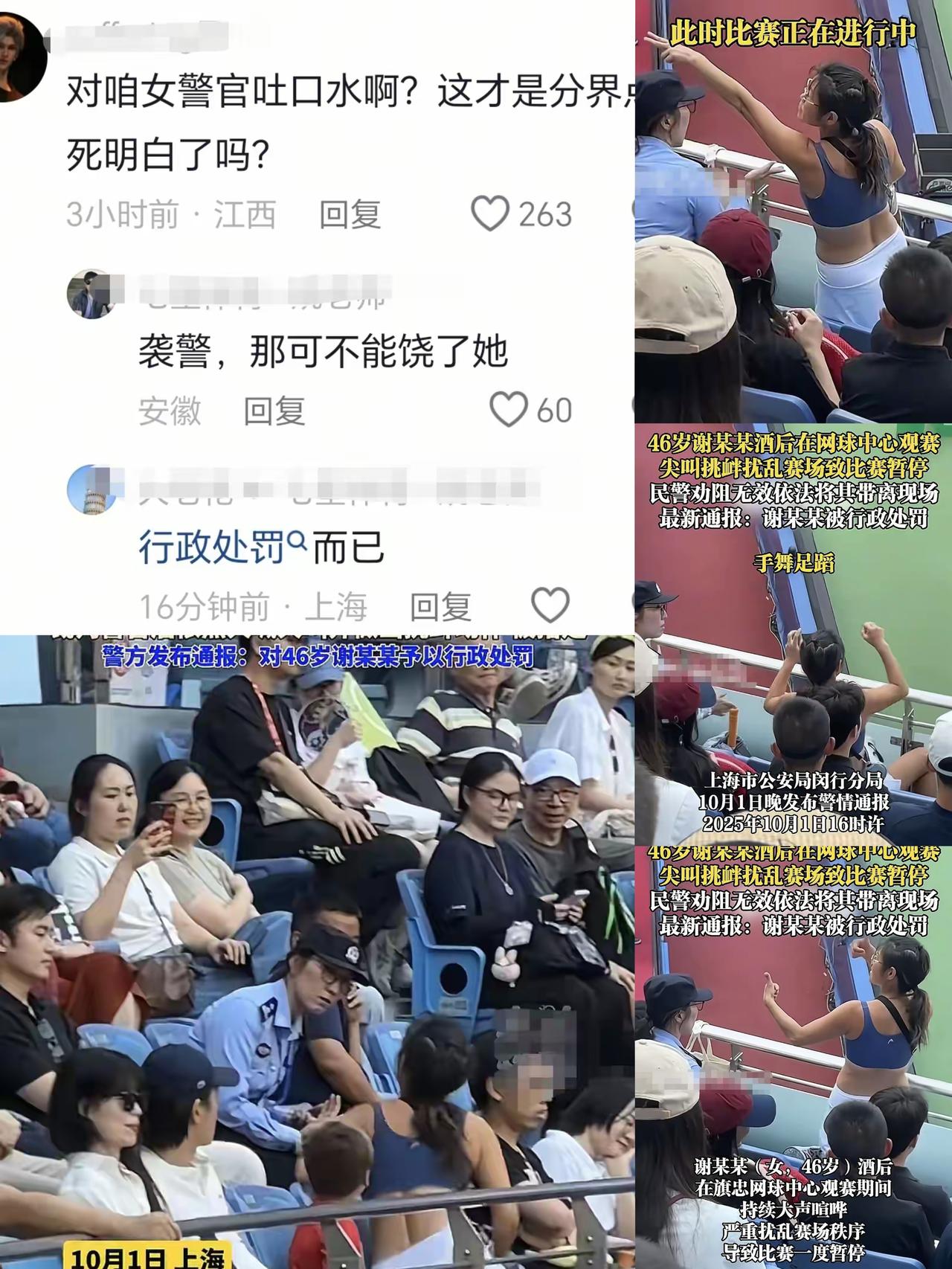 上海球赛闹剧后续! 46岁女子被处罚 老公身份才是关键 国庆当天上海网球赛那出闹剧,警方通报终于来了!46岁的谢某某酒后在看台上疯狂尖叫,直接把比赛喊停,连她带的小男孩都劝不住,对着安保还各种挑衅。 后来更夸张,人家好言相劝,她居然掏出护照挥舞,意思是自己不好惹?最后被安保抬出场时,全场观众全在鼓掌喝彩。现在警方明确说了,已经给她行政处罚了,不管谁都得守规矩。 网友顺着线索一扒,这姐们儿背景不简单:开80万保时捷,老公是瑞典籍外企高管,她自己还有瑞典绿卡。难怪敢这么嚣张,可惜规矩面前,啥身份都不好使。 有人说“相由心生”,这股蛮横劲儿确实藏不住。大家觉得是酒壮怂人胆,还是真觉得有身份就可以特殊?评论区聊聊~