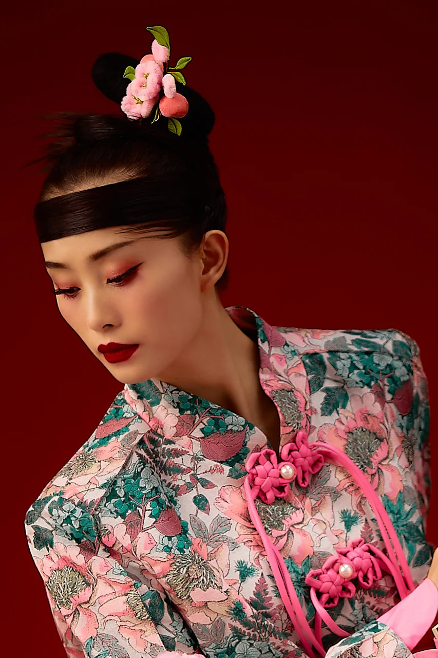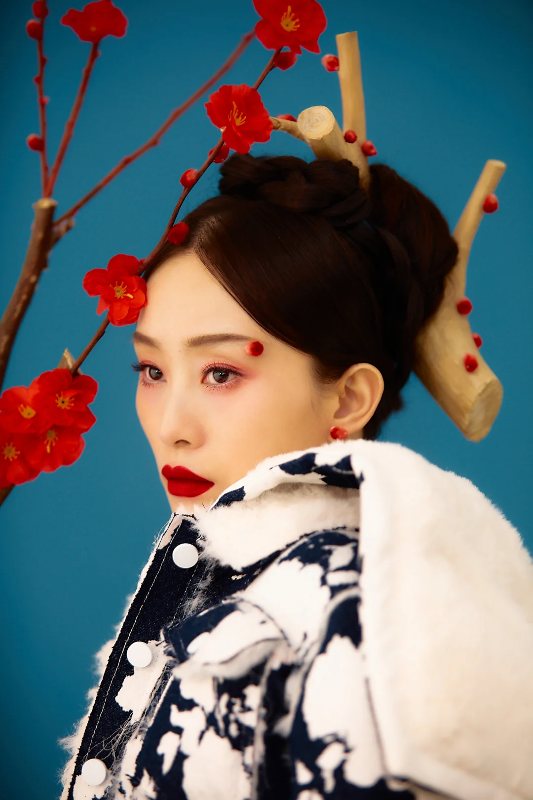 很中式的妆容,其他地方弱化处理,加深了唇色和眉毛的浓度对比度,很符合中国画笔墨丹青的感觉,其他地方的大留白也符合中国传统审美。发型上有种枯木逢春、欣欣向荣的感觉,在里边使用了枯木加点小梅花