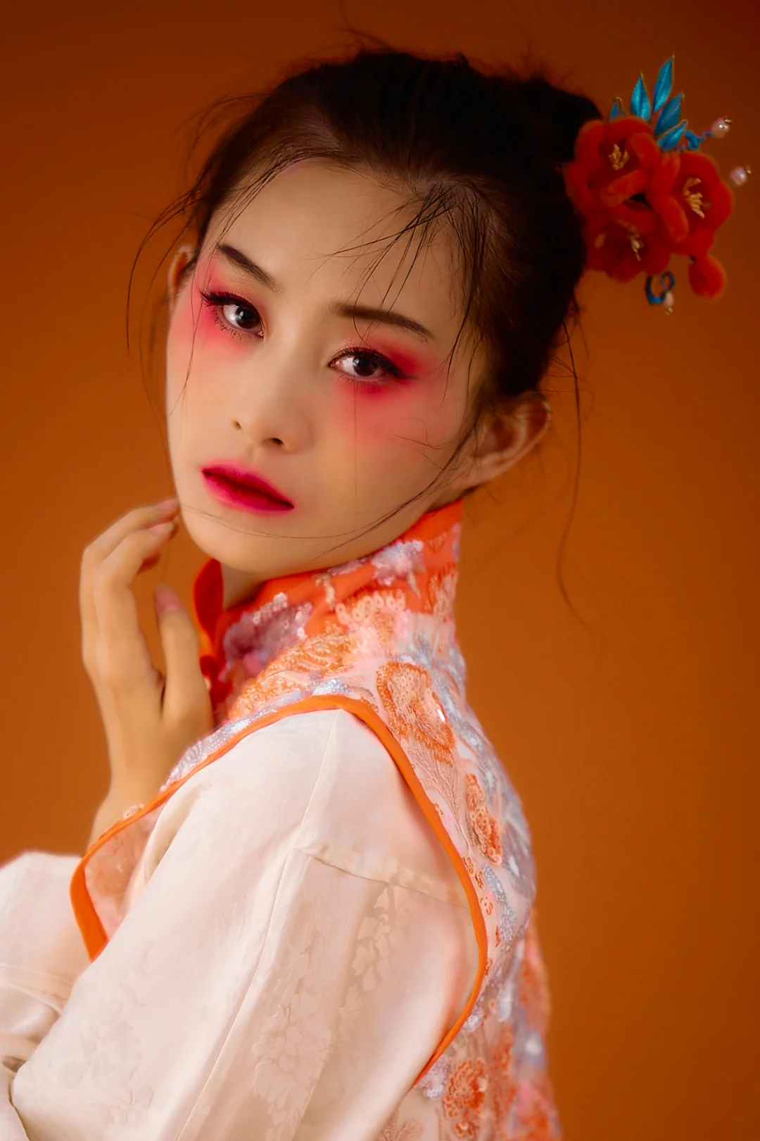 主要突出醉字,妆容重在晒红上面,很像中国传统戏剧里面的拍彩,胭脂和眼影融为一体,从鼻山根淡淡晕染开,有一种醉酒后的红晕感。发型在脸上有一些凌乱的碎发,微醺之后有