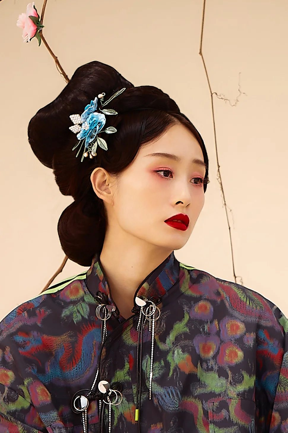 以蔷薇为主题,发型上参考了戏曲的元素,如发型的波纹、发髻。龄官本身是戏子,有一种心比天高命比纸薄的心态,妆容里边略有风尘感,风尘感展现的是戏里的人设,但同时又会有比较单纯和天真的感觉,所以整个妆容画的比较满,从睫毛到眼线眉毛睫毛都化了。整个造型中发型最为夸张,因为戏剧化舞台化,符合戏子的人设,同时也用夸张的发型压一下妆容,表现戏里戏外不分的人设