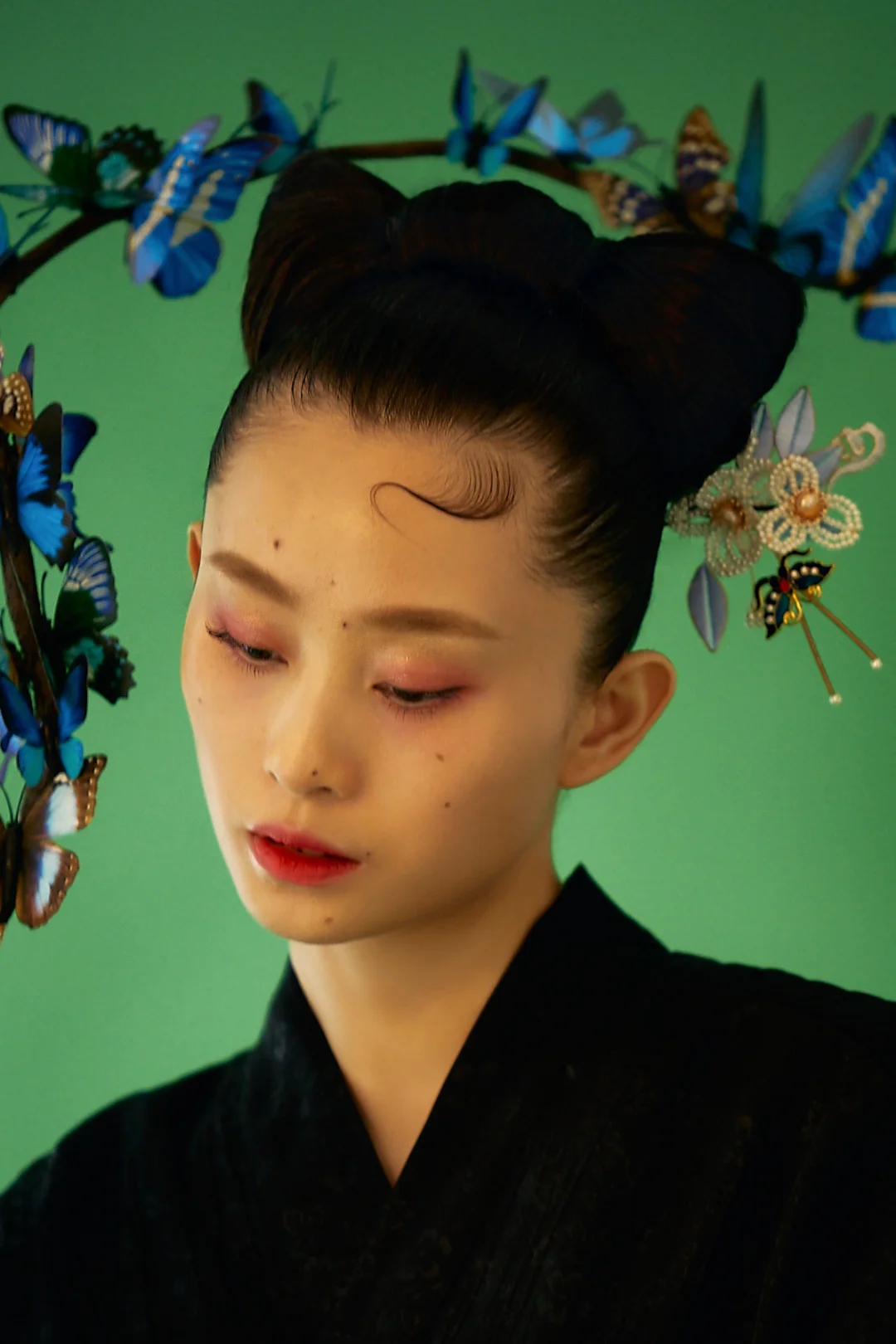 用妆容刻画人物心理活动,宝钗给人是端庄沉稳的一个人设,扑蝶有显示了小女孩可爱活泼的一面。所以就在很淡雅的底妆上点了很多痣,可以说是调皮可爱的一种,也可以是完美无瑕中的一些小瑕疵。在这个基础上发型做了一个蝴蝶结,整体以蝴蝶为元素