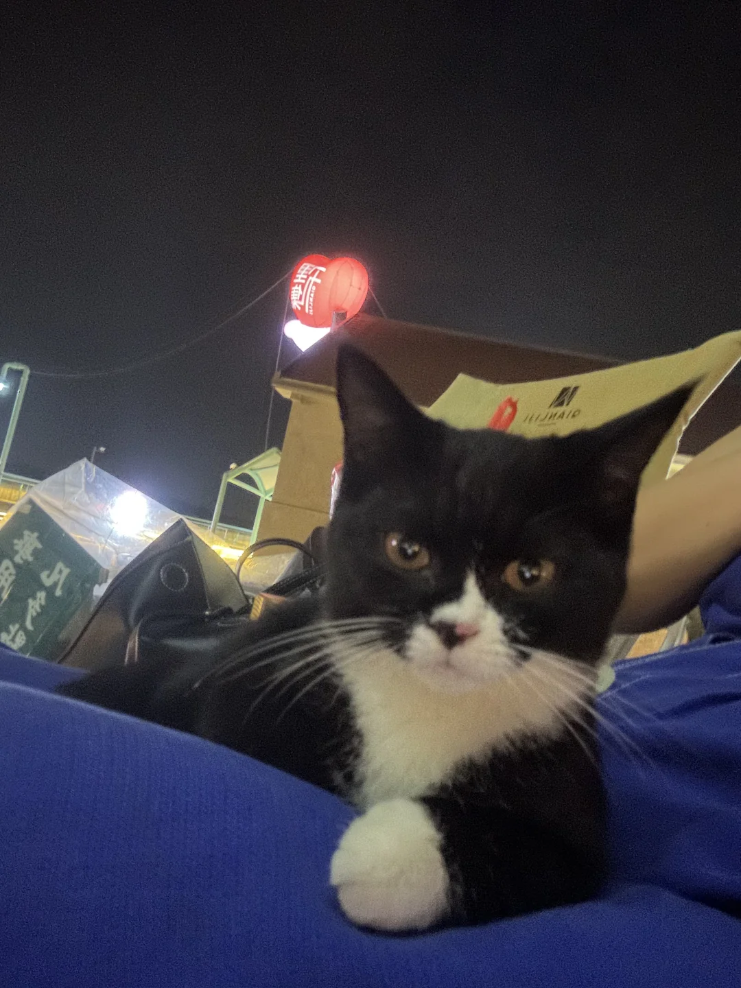 可是我没有带吃的啊!等我忙完了三个钟吧,她还在椅子上,我就外卖了个罐头给她吃,然后我们就收摊换了个地方坐了,结果!她又跑过来,直接跳我身上坐着了!