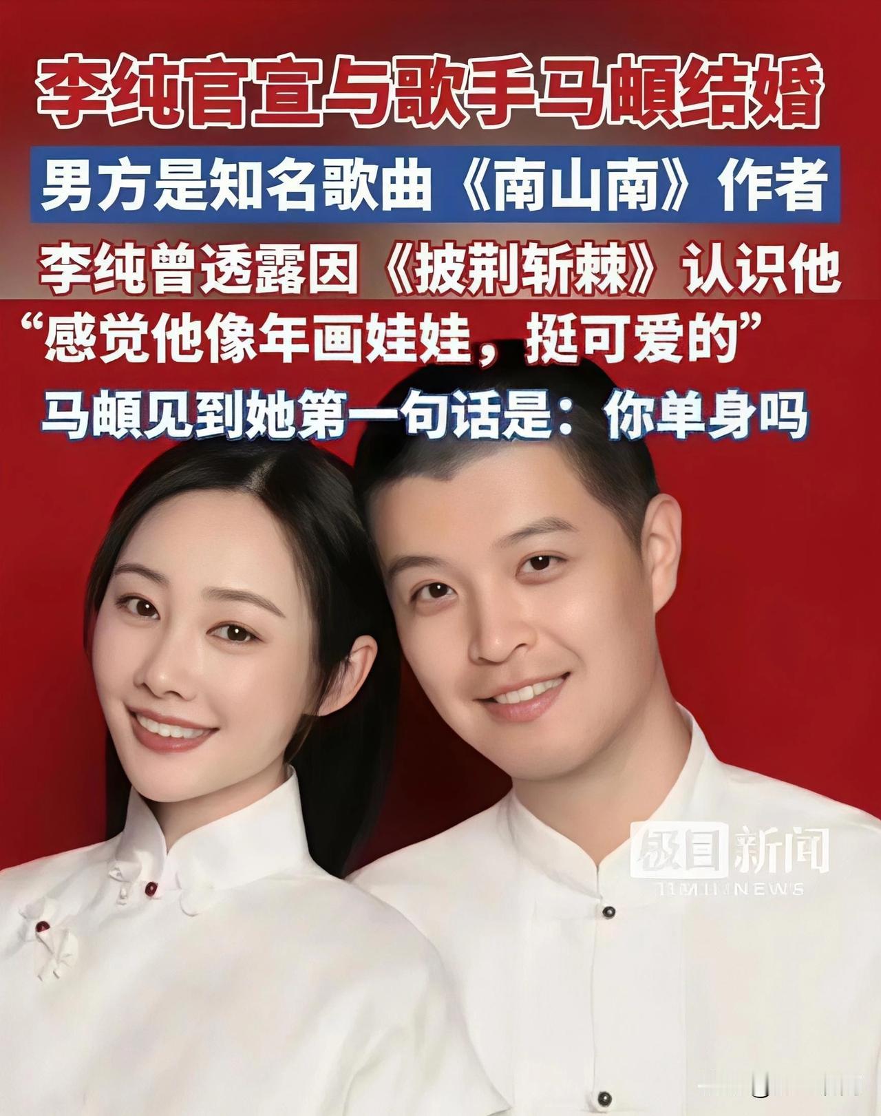 为什么他们的孩子要叫马思纯呢?李纯马頔(di第二声)结婚啦,李纯:恭喜你哦,马頔:也恭喜你 有网友评价:马頔,不亏是北京纯爷们,司理理落入你手了。 李纯也演了好多角色,霓漫天,柳如丝,司理理等,但是很多人还是不知道她是谁。 还有人说他前段时间多次上五哈,为了装修房子和结婚。 果然情人眼里出西施啊,年画娃娃是什么样来着? 原来马頔是一见钟情啊,见面第一句话就是:你单身吗? 互相喜欢不就行了,没有必要在意那么多。