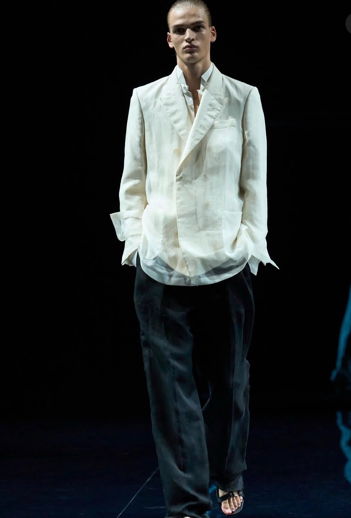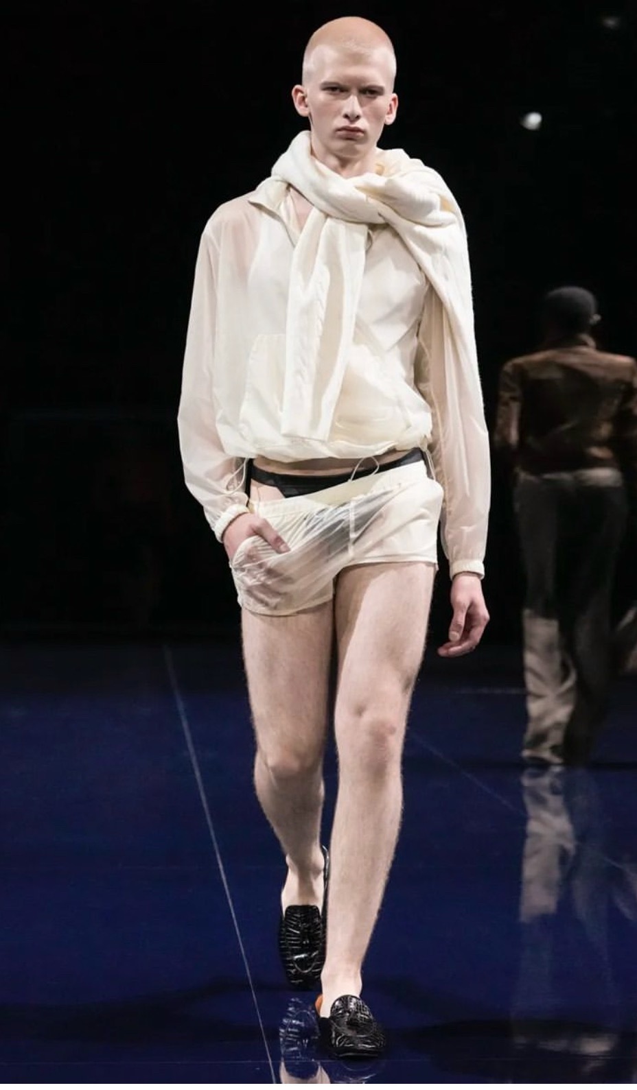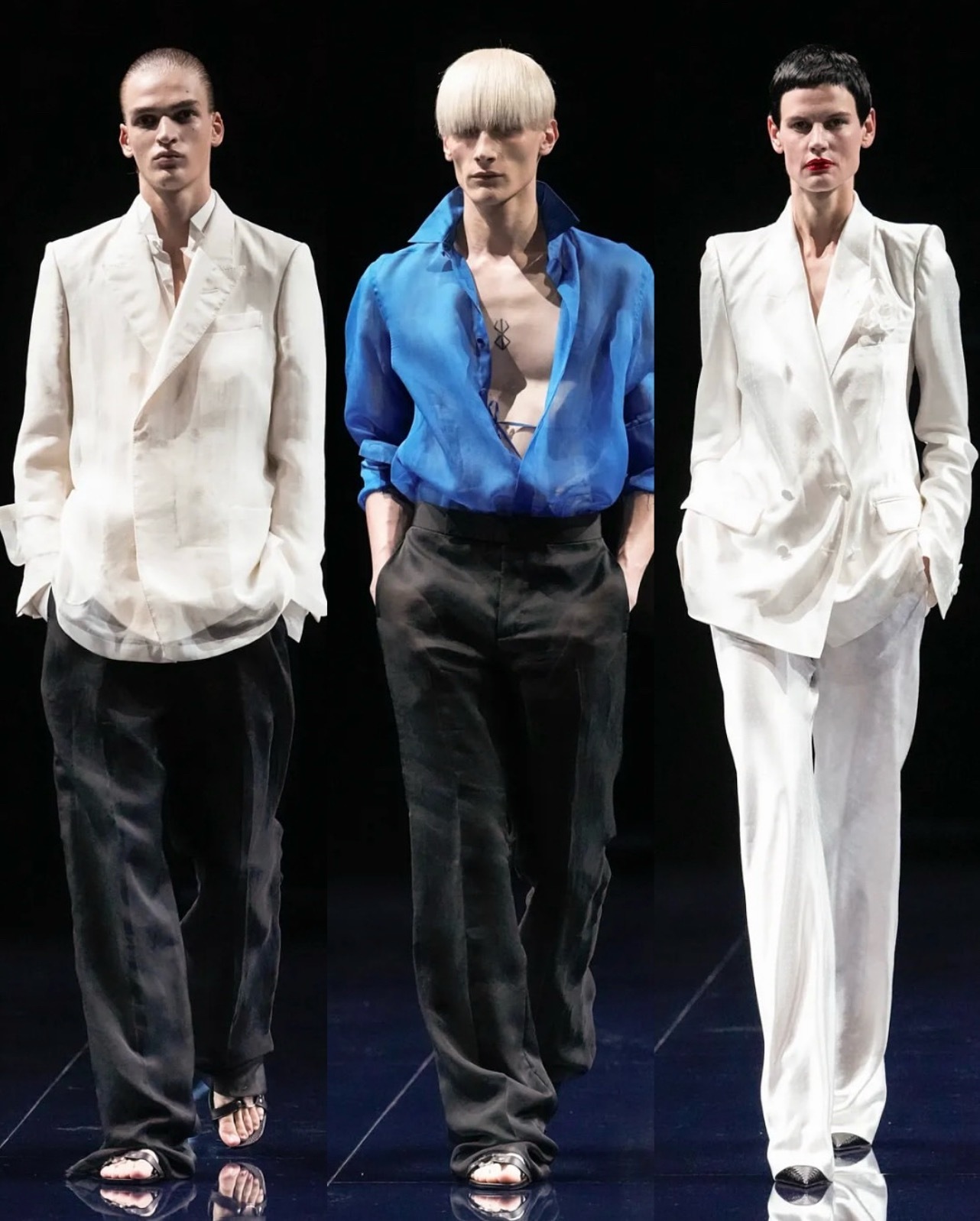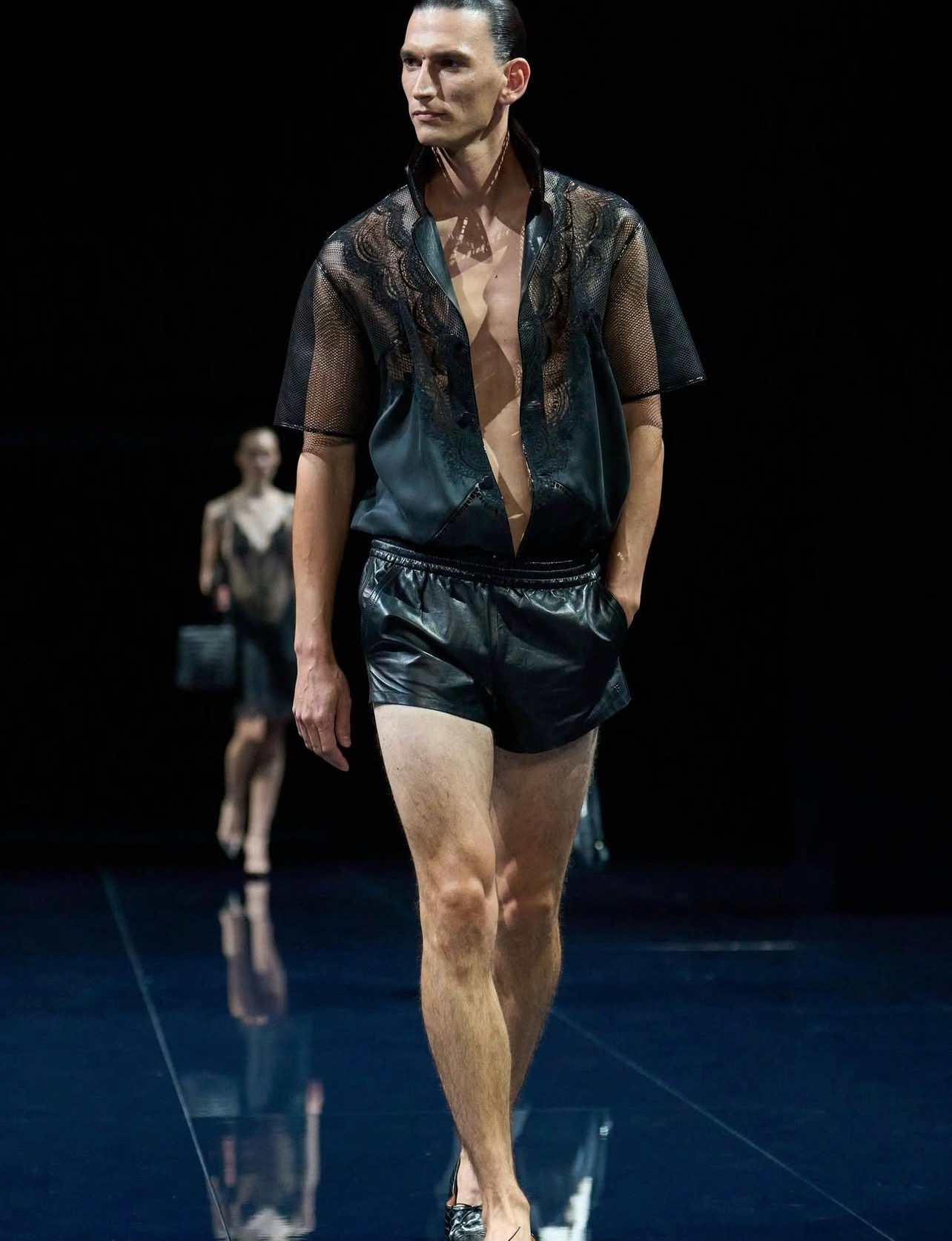 由创意总监 HAIDER ACKERMANN 打造的 TOMFORD2026春夏时装秀。本季秀场犹如午夜海洋。服饰延续了TOMFORD标志性的优雅,但融入了 Ackermann 独有的自由感:小巧三角上衣取代衬衫,男士透明短裤,金属线结构的晚装,打造出不对称且轻盈的身体轮廓。