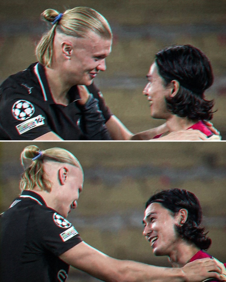 哈兰德与南野拓实赛前拥抱寒暄,此役哈兰德为曼城打进2球,而效力于摩纳哥的南野拓实担任替补未能出场。