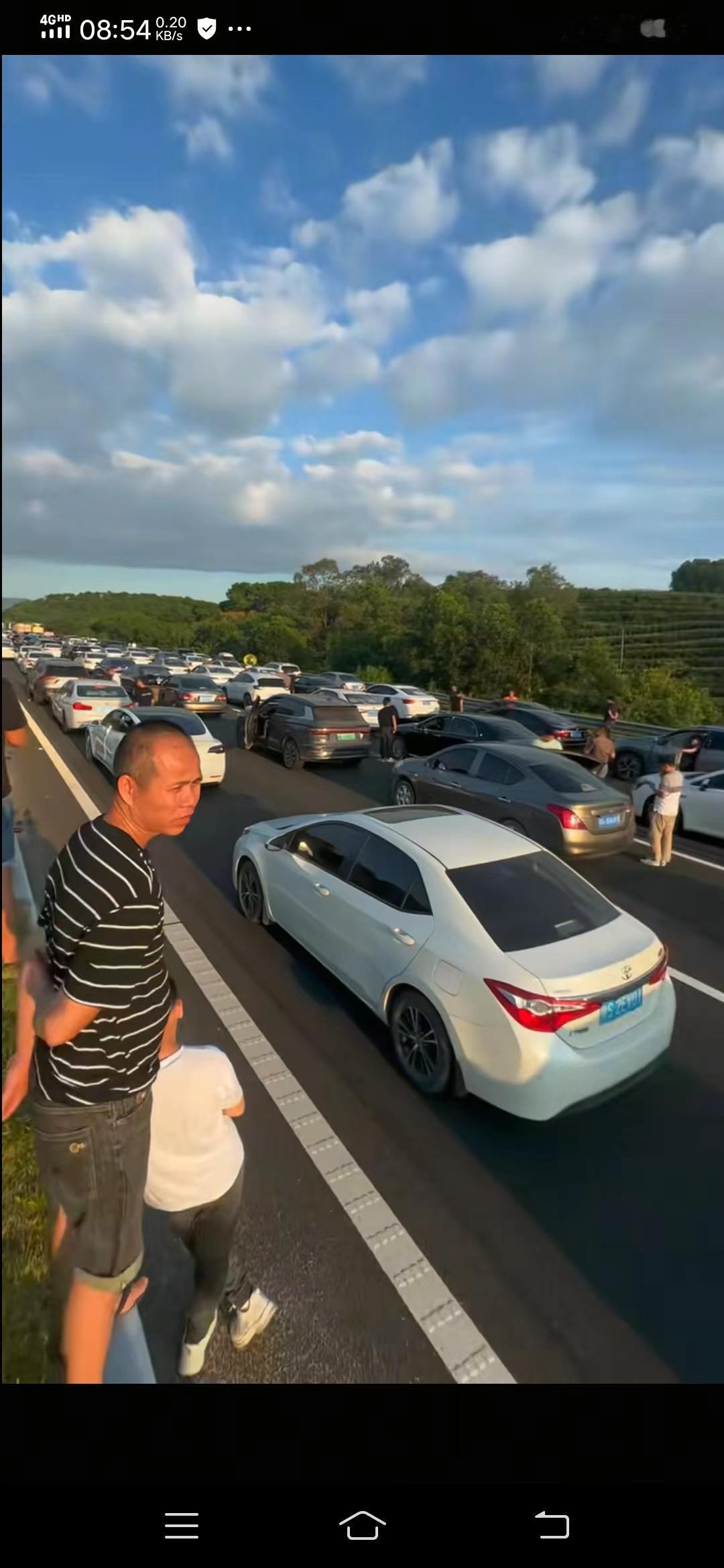 堵车了!何时才是个头? 一家四口,就图省这点过路费,现在是下午4点,我愿出20块钱买一瓶纯净水,40块钱买一个肉包子,100块钱买一包紫云烟,你有吗?拿来! 不来想出来玩,来了现在堵在路上,还不知道何时能走,更不知道何时能吃上饭睡个好觉,一切都只能问路了!何苦呢?我想找卫生间,哪里有?眼睛闭上样样都有,有个铲铲! 再折腾油都快没有了,手机早没电了。 那些人还有闲心跳舞、跳绳、打朴克,有的还干起麻将来了。 算了吧!听天由命。
