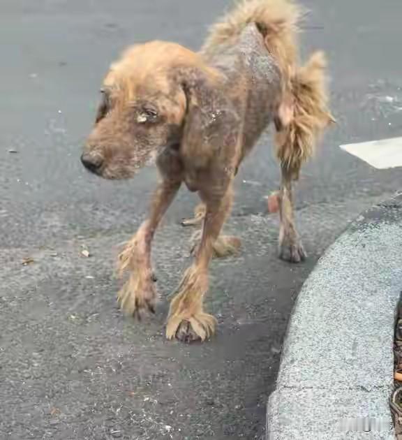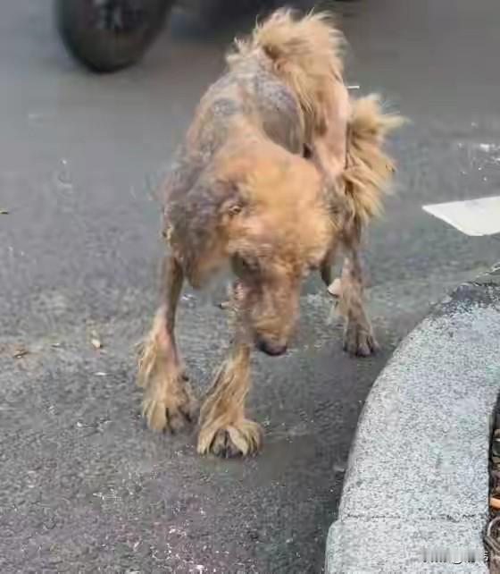 这天一位大哥去城里办事,结果在路边看到一只非常狼狈的狗狗,它全身的毛发缺失很严重
