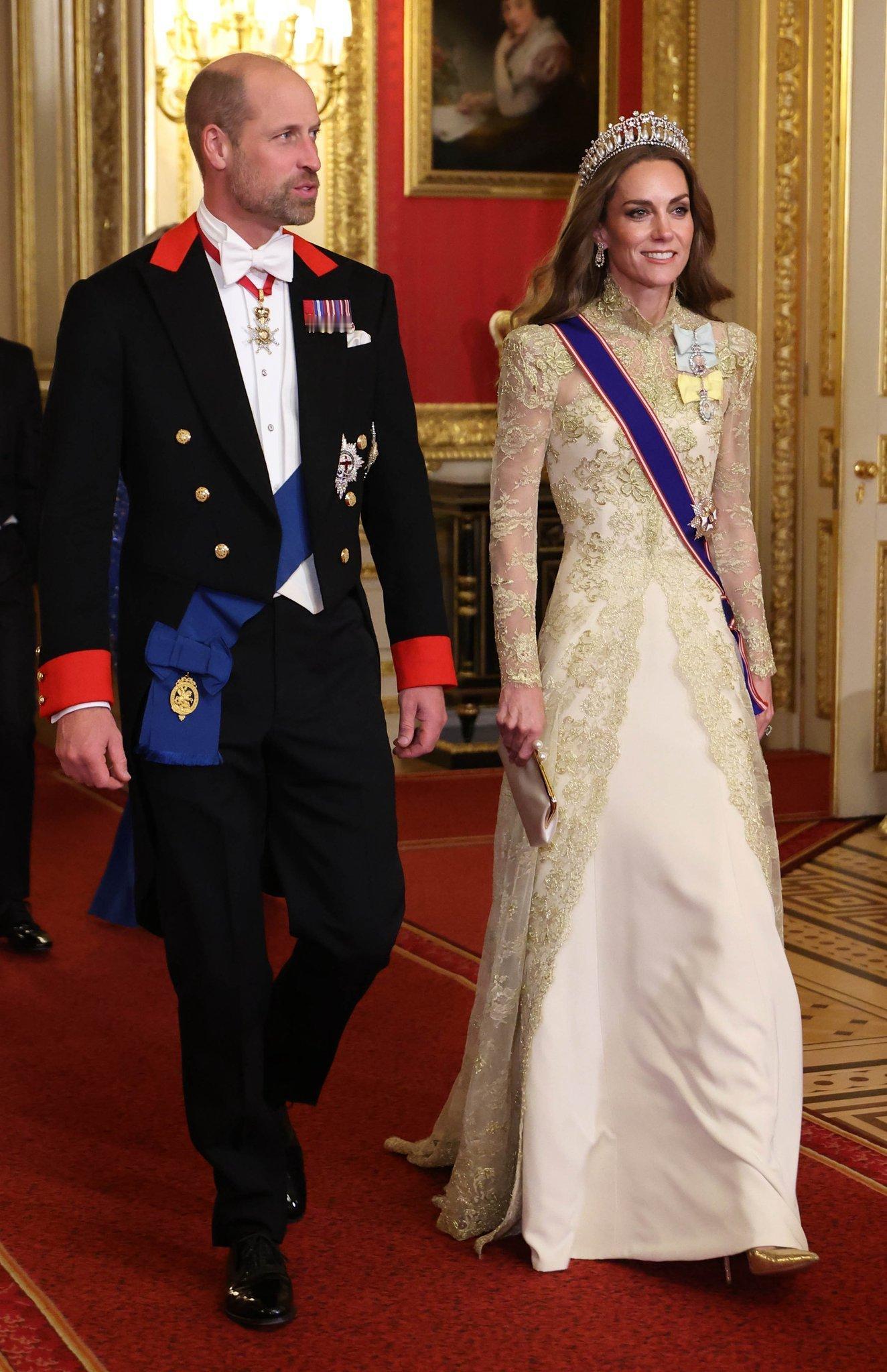 17日~18日,接待来访的🇺🇸总统特朗普夫妇(),晚宴礼服好评,据英媒报道,也是为彰显对英国纺织业和创造力的支持();
