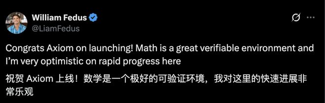 前OpenAI高管WilliamFedus认为数学是一个极好的可验证环境,他对于Axiom的快速进展十分乐观。