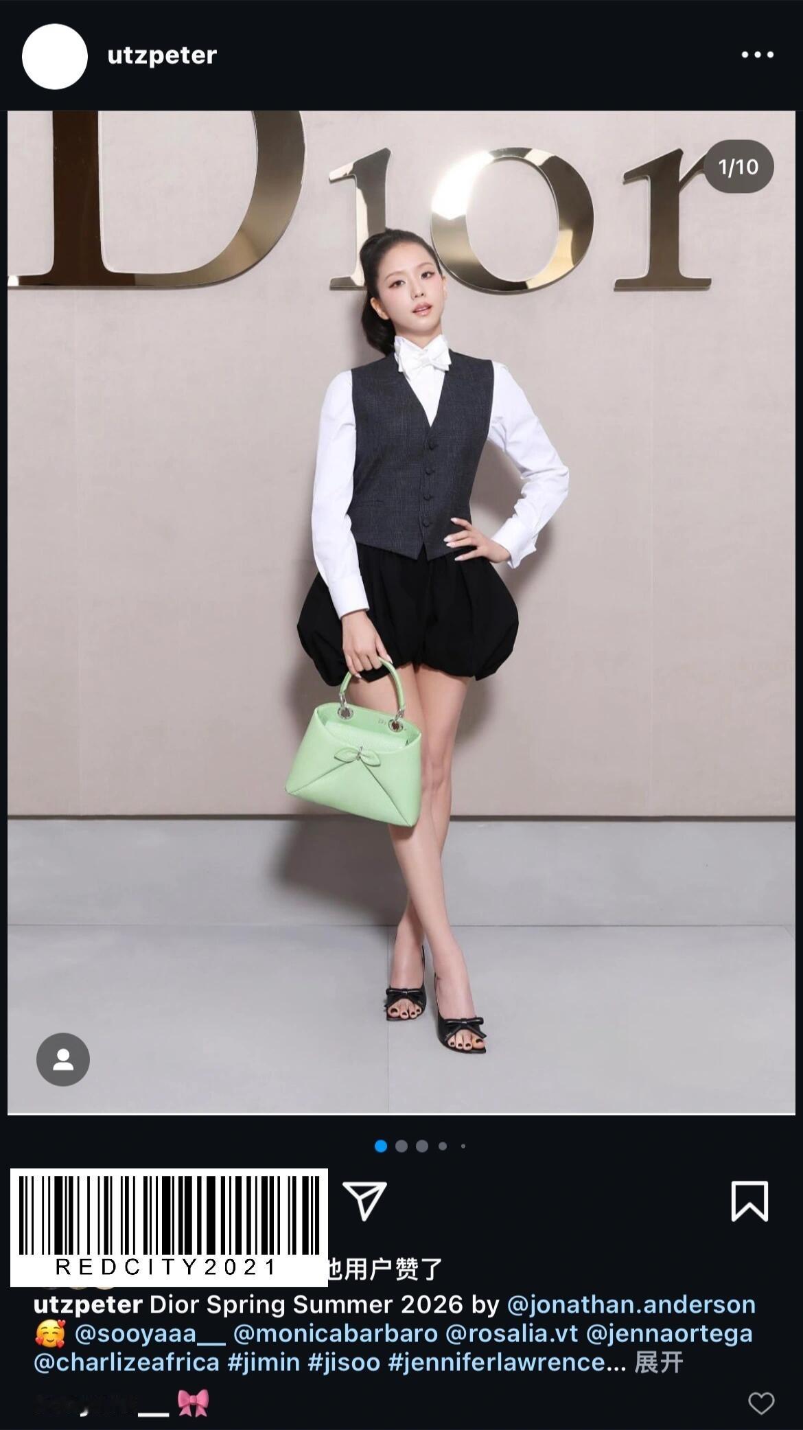 Dior官方INS全球首发金智秀,其他社交账号也是如此,此次看秀上身的衣服也是特