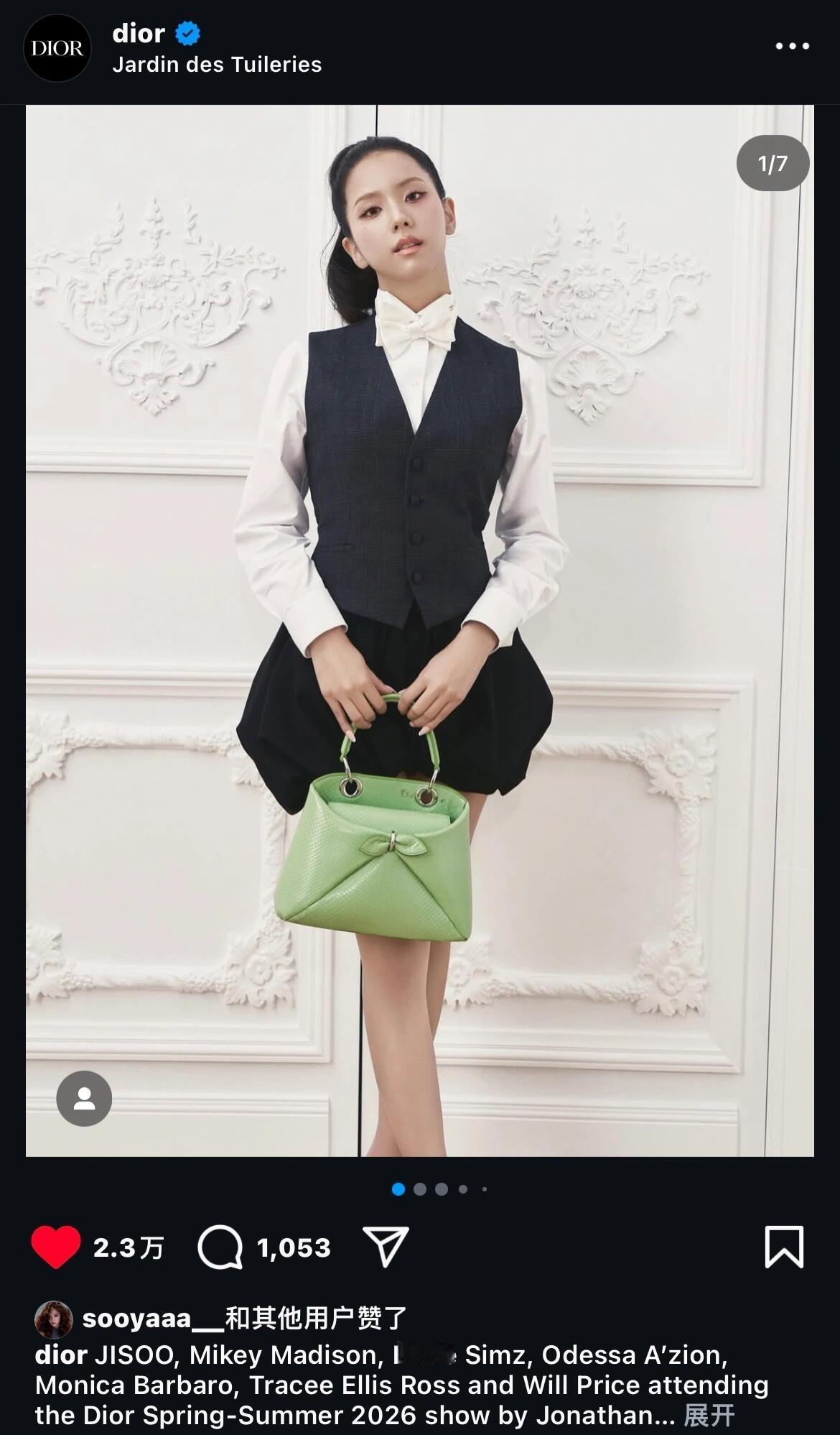 Dior官方INS全球首发金智秀,其他社交账号也是如此,此次看秀上身的衣服也是特别定制,加上之前上身的绿裙,合计两套特别定制,不愧是当家花旦~