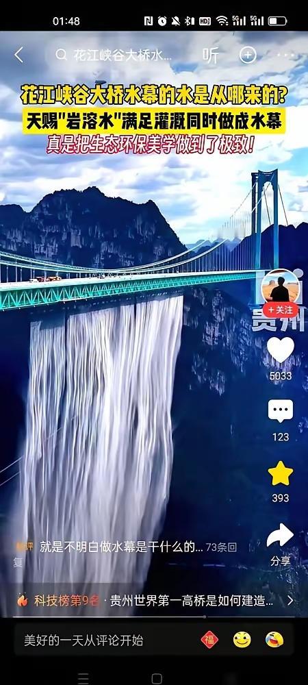 我越来越怀疑,花江峡谷这座桥,可能压根就不是拿来通车的。或者说,通车,搞不好只是它最不起眼的一个附加功能。 最近看新闻才知道,这桥9月28日刚通车,625米高的桥面能俯瞰“地球裂缝”花江峡谷,主跨1420米的钢桁梁悬索桥,论高度和跨度都是世界第一。但最让人意外的是它的“隐藏技能”——夜景灯光像科幻片,桥体挂着世界最大人工瀑布,桥墩刷成五彩卡通画,连官方报道都在说周边民宿国庆全订满,这哪是桥?分明是“基建+文旅”的新物种。 网友: 最先是湖北那个中国第一高桥,以前经常从那里过,每次都好想停车欣赏一下,结果不但没停车位,还到处是不准停车警示牌,现在的第一高桥,不但修了专门停车服务区,还巴不得你住下来在桥上桥下耍几天,这就是观念的进步啊! 一座桥带活一片经济,这种设计理念,只有我们中国人想得出来!我们的任何事情。都是围绕中国式现代化展开的。向花江峡谷大桥的建设者致敬!