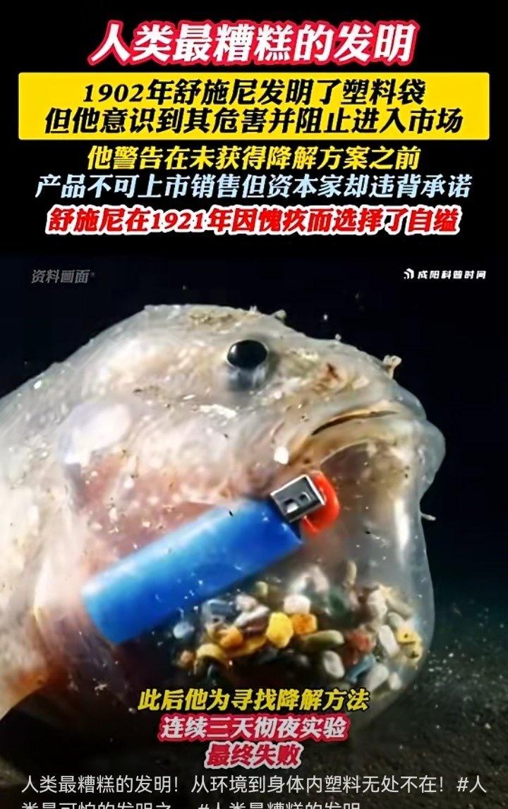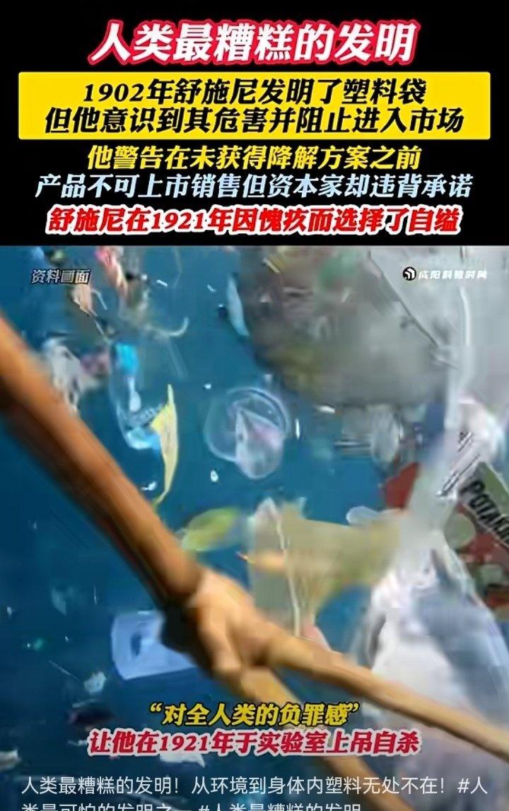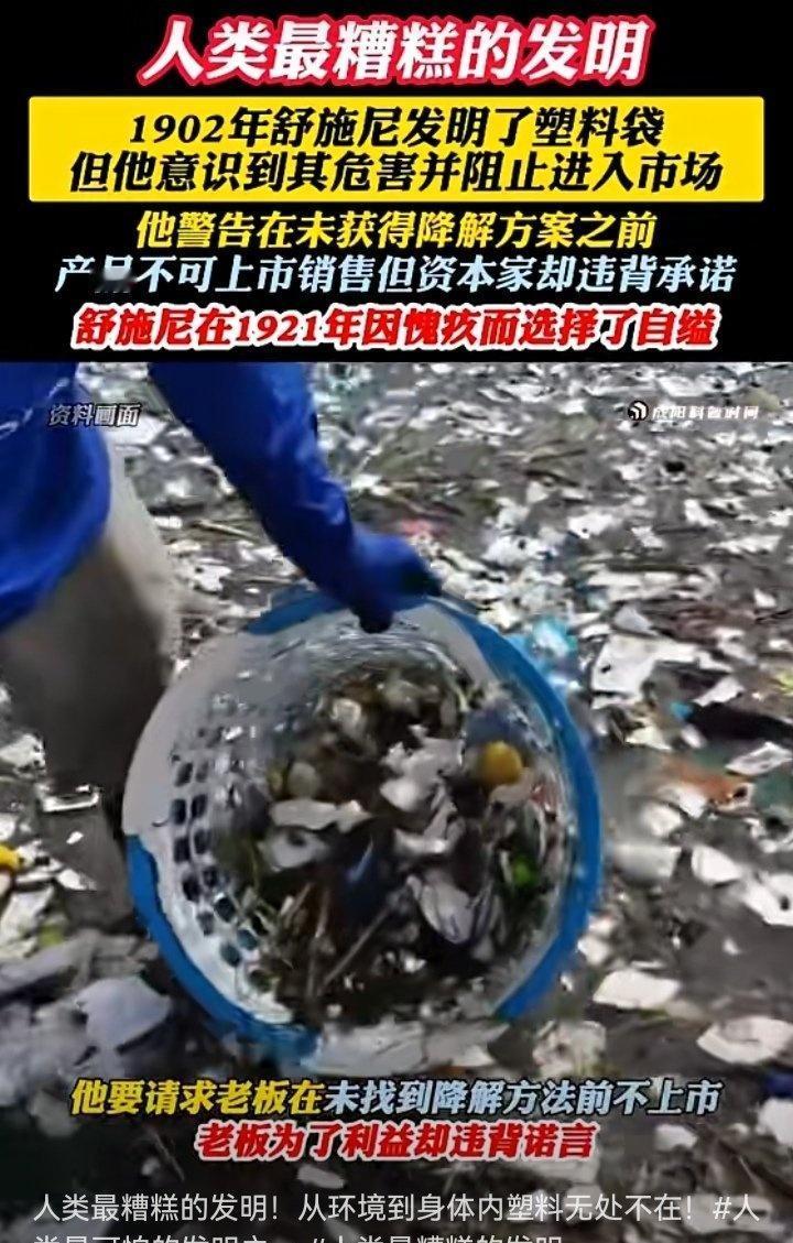塑料发明人 舒施尼 真正的科学家 道德洁癖很高的 但资本在巨大的利益面前 很难不唯利是图 so 结局 很遗憾 【马克斯·舒施尼的发明】 1902年10月24日,奥地利科学家马克斯·舒施尼发明了塑料袋。这种包装物既轻便又结实,在当时无异于一场科技革命,人们外出购物时顿感一身轻松,不需要携带任何东西,因为商店、菜场都备有免费的塑料袋。 【马克斯·舒施尼的忠告】 作为科学家,马克斯·舒施尼在发明出塑料袋的同时,也已经意识到塑料袋所带来的危害,于是忠告老板在他还没找到可降解的方法之前,不可以让塑料袋上市,他的老板答应了。 【马克斯·舒施尼自杀】 他的老板在利益的驱使下违背自己的诺言,于是这位伟大的工程师为了捍卫自己尊严,最终选择了自杀,他是一个有良知和责任感的科学家。 【塑料袋对人类的危害】 由于塑料袋大都是用不可再生降解材料生产的,处理这些白色垃圾只能挖土填埋或高温焚烧。这两种办法都不利于环保。据科学家测试,塑料袋埋在地里需要200年以上才能腐烂,并且严重污染土壤。而焚烧所产生的有害烟尘和有毒气体,同样会造成对大气环境的污染。