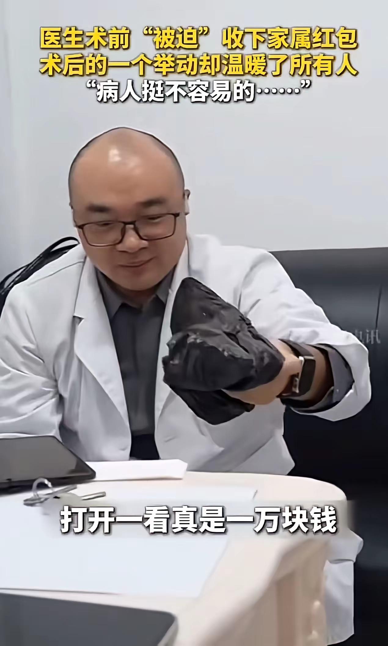 “这个医生火了!” 北京朝阳医院,有家属给赵会医生塞了一个一万块钱的红包,希望赵主任能全力以赴操刀手术,医生为了家属安心没有推辞。 但他随后没有丝毫犹豫,拿着红包径直来到了医院的缴费窗口,交代工作人员说:“这是患者家属给的红包,麻烦你帮我把这钱充到他们的住院费里。另外,再帮我拿一个收据,我回头给他们。” 真是太暖心了!有网友说:北京朝阳医院骨科赵主任不但医术精湛、人品更是高尚,他的做法值得全国医务人员学习。 多么希望我们的医生都能够像赵会这样的医者仁心者,我们的社会的每个角落都会很温暖和干净。 不过也有网友担心:万一手术出了意外,这个红包如何说得清?或者术后退了红包,结果手术效果欠佳,你说该如何解释? 还是建议以后再遇到这种情况,为了避免不必要的麻烦,还是当场拒收稳妥,并耐心解释清楚,不收红包一样认真医治。 大家怎么看呢?