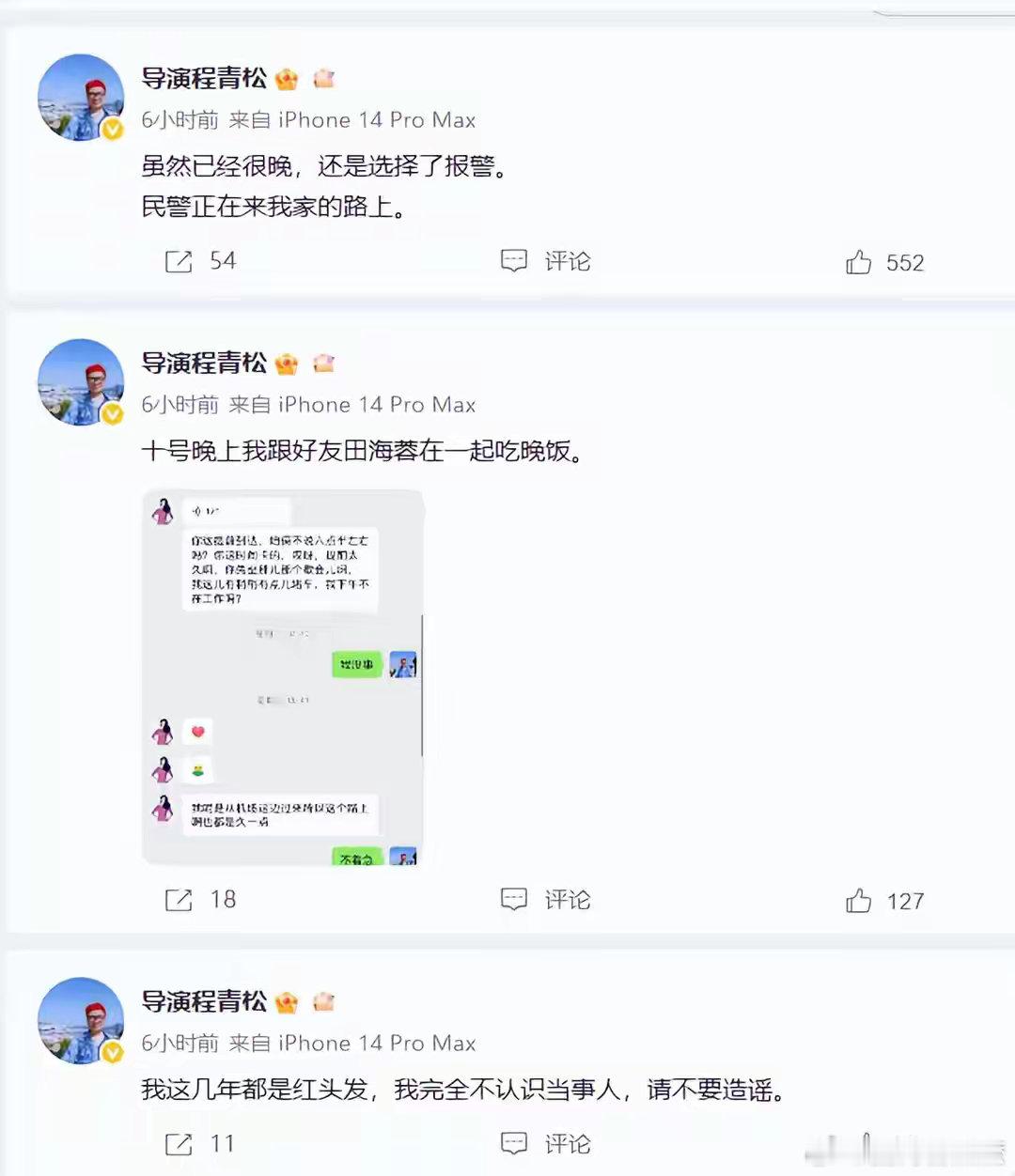 演员田海蓉否认与yml相识,称导演程青松断章取义公开聊天记录拒删撤,将起诉程青松