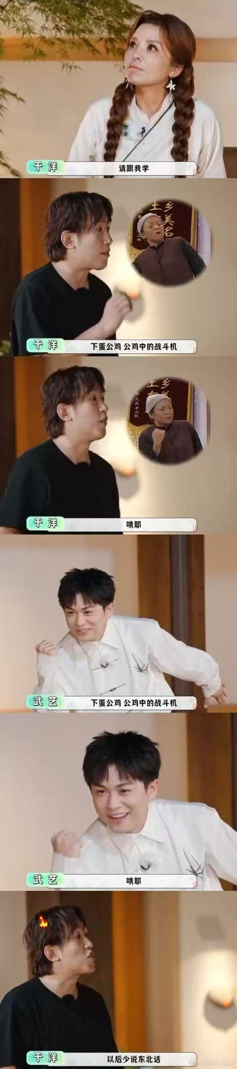 武艺被于洋单方面禁止说东北话 于洋武艺的好友日常太欢乐!围坐聊春晚名场面时,于洋直接“命令”武艺“乖乖听话”,武艺不懂但照做,还贡献“下蛋公鸡,公鸡中的战斗机”2025国庆版,笑点超密集!