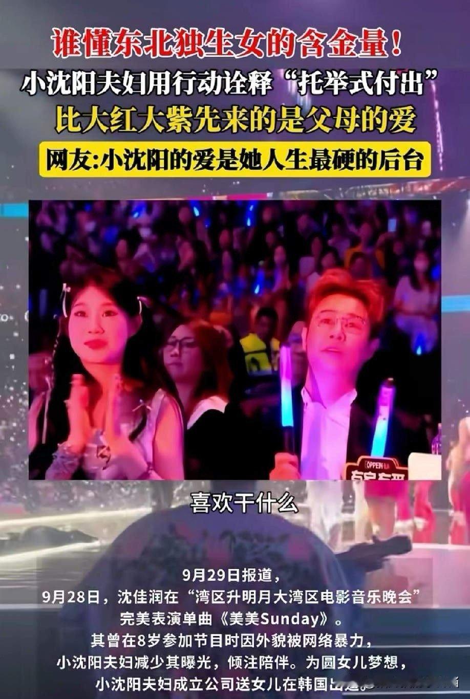 长大后“我愿意接受所有的评论”,说这话沈佳润真的太令人喜欢了,不愧是小沈阳口中的美美小孩宝,看了沈佳润的采访,小孩说话言之有物,条理清晰,谦虚,一看就是个乖乖女,是父母的小棉袄,谁说沈佳润不行的,人家英语韩语棒的很,全开麦舞台也很惊艳,舞蹈也不错