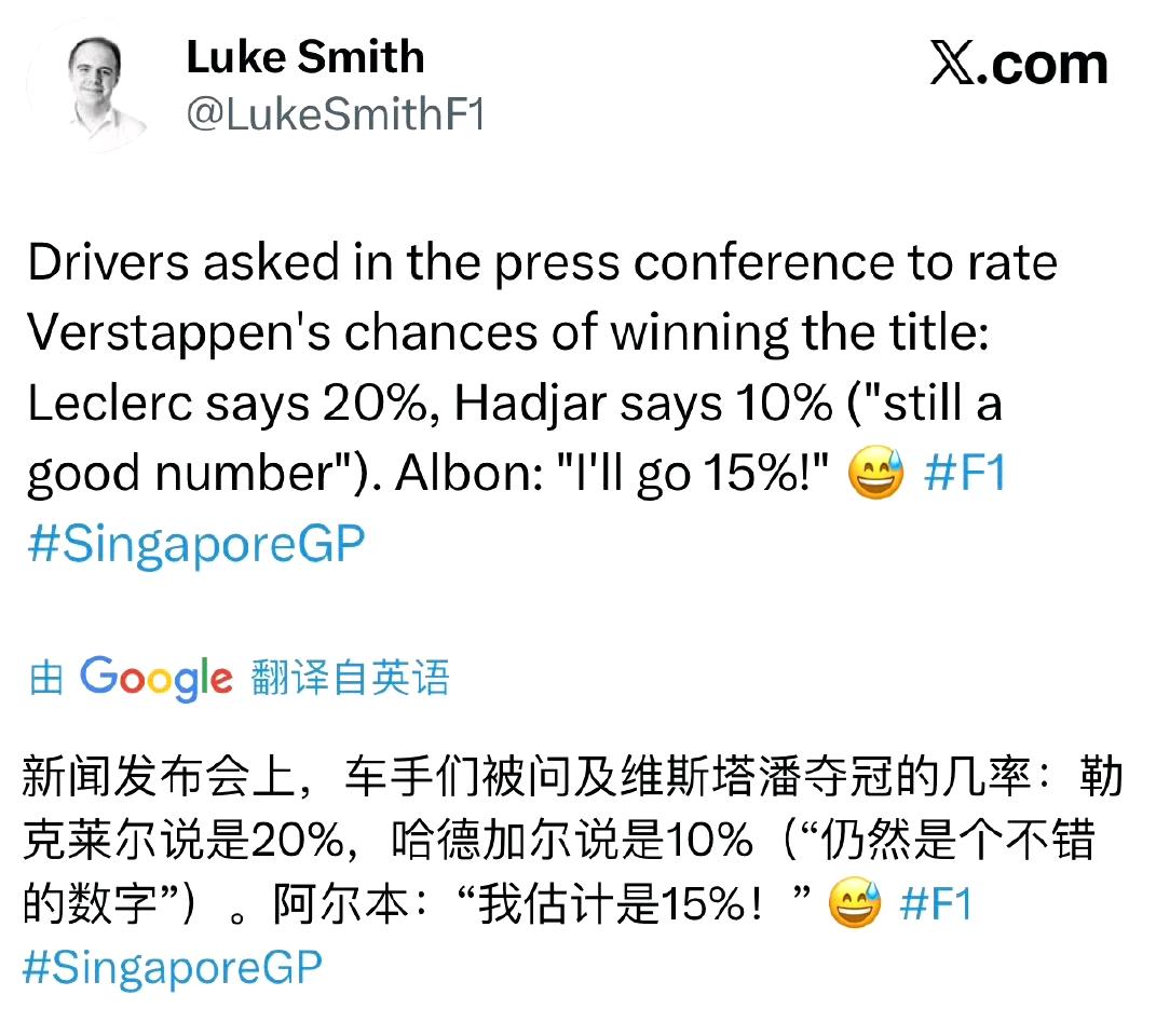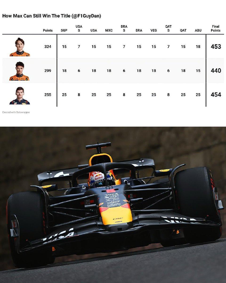 维斯塔潘夺冠概率标准答案公布了,不是10%也不是100%,而是50%。 维斯塔潘:“我觉得是50%,要么赢,要么不赢”。 维斯塔潘夺冠条件:剩下的7站比赛,维斯塔潘需全胜,皮亚斯特里只能得一站亚军或者诺里斯不能夺冠。