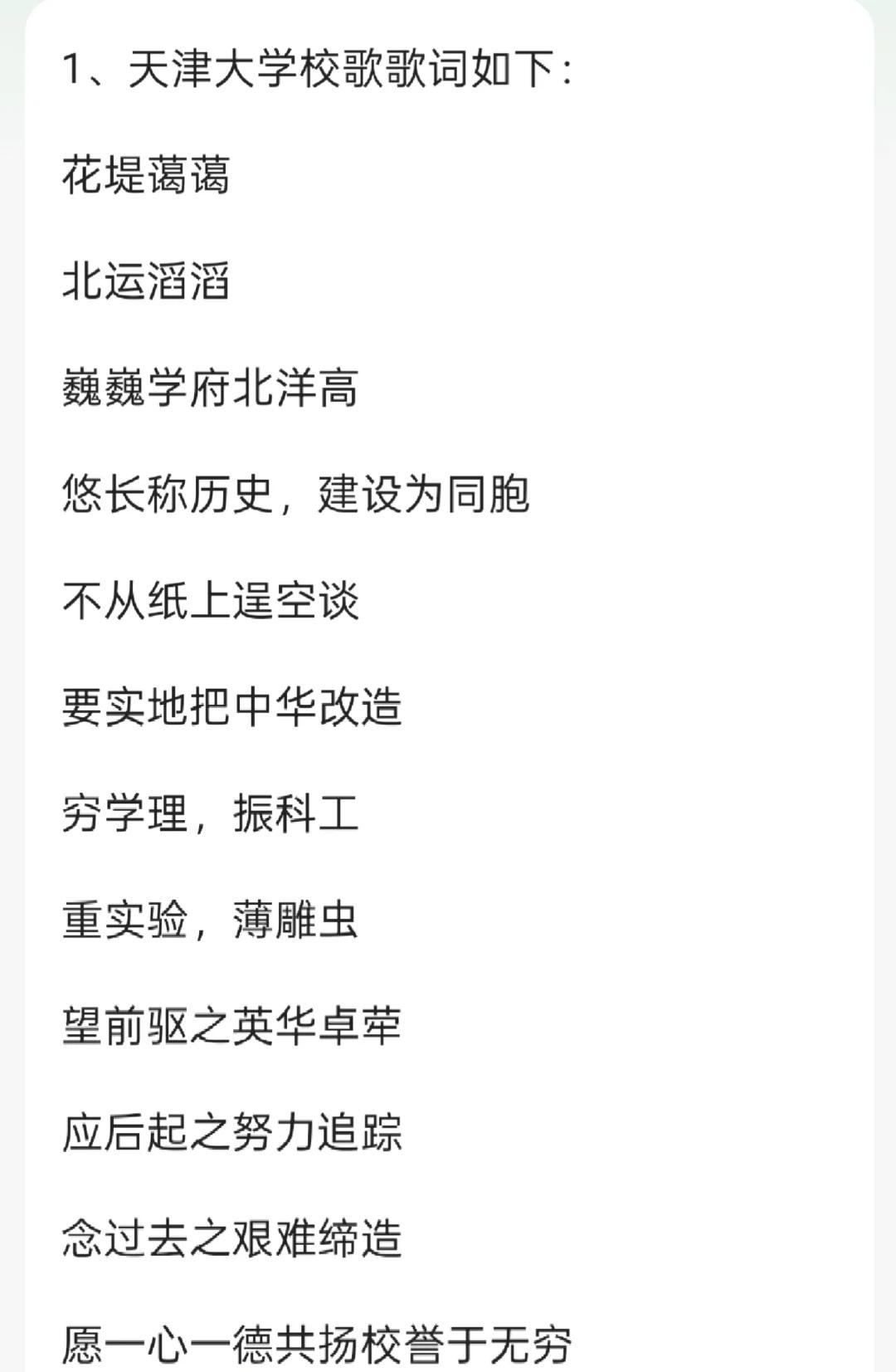 花堤蔼蔼,北运滔滔,巍巍学府北洋高 熙熙攘攘的人群中有许多头发花白的夫妻,让人心中为之一触,仿佛电影融合成了现实。徜徉在天大130周年校庆的校园,听着广播里的校歌,不由得想起西南联大精神,想起了中国近代教育史上可歌可泣的故事。曾读《陈寅恪与傅斯年》,为之动容,慨叹于那个时期的教育事业,不论是老师还是学生,身上都有一种深沉的情怀。从北洋到天大,130岁的天大从战火中走来,开中国高等教育之先河。望前驱之英华卓荦,应后起之努力追踪。百卅荣光,强国担当。亲爱的天大,130年生日快乐!