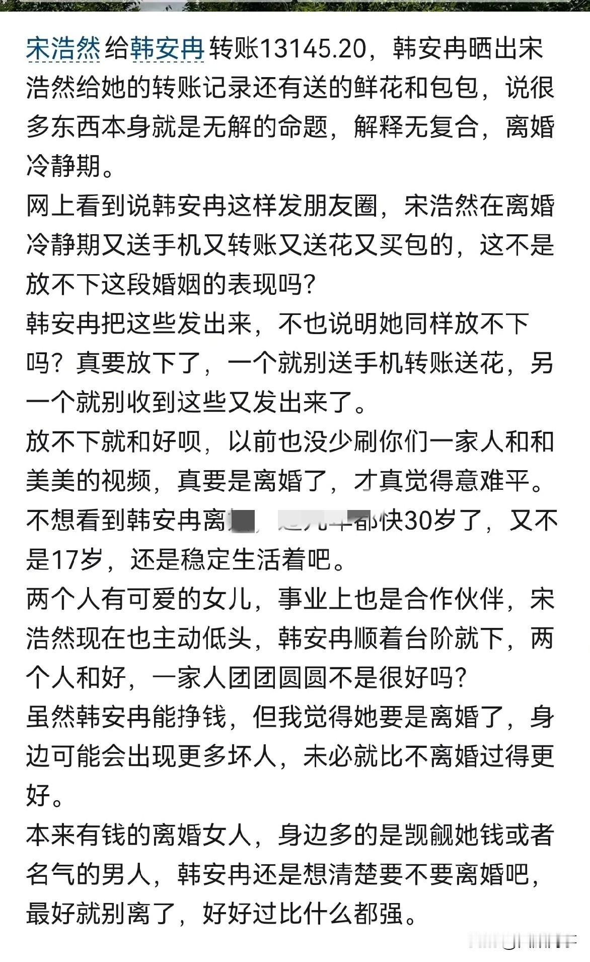 宋浩然送礼物想挽回婚姻, 但被韩安冉拒绝! 宋浩然在离婚冷静期给韩安冉转账13145.20,还送韩安冉爱马仕包包,韩安冉发朋友圈很多东西就是无解的命题! 韩安冉粉丝发文表示不希望两人离婚,劝韩安冉马上30岁了,为了两个女儿还是稳定生活吧,宋浩然既然主动低头,韩安冉顺着台阶下,两人和好一家人团团圆圆不好吗?离婚了身边会出现更多坏人!