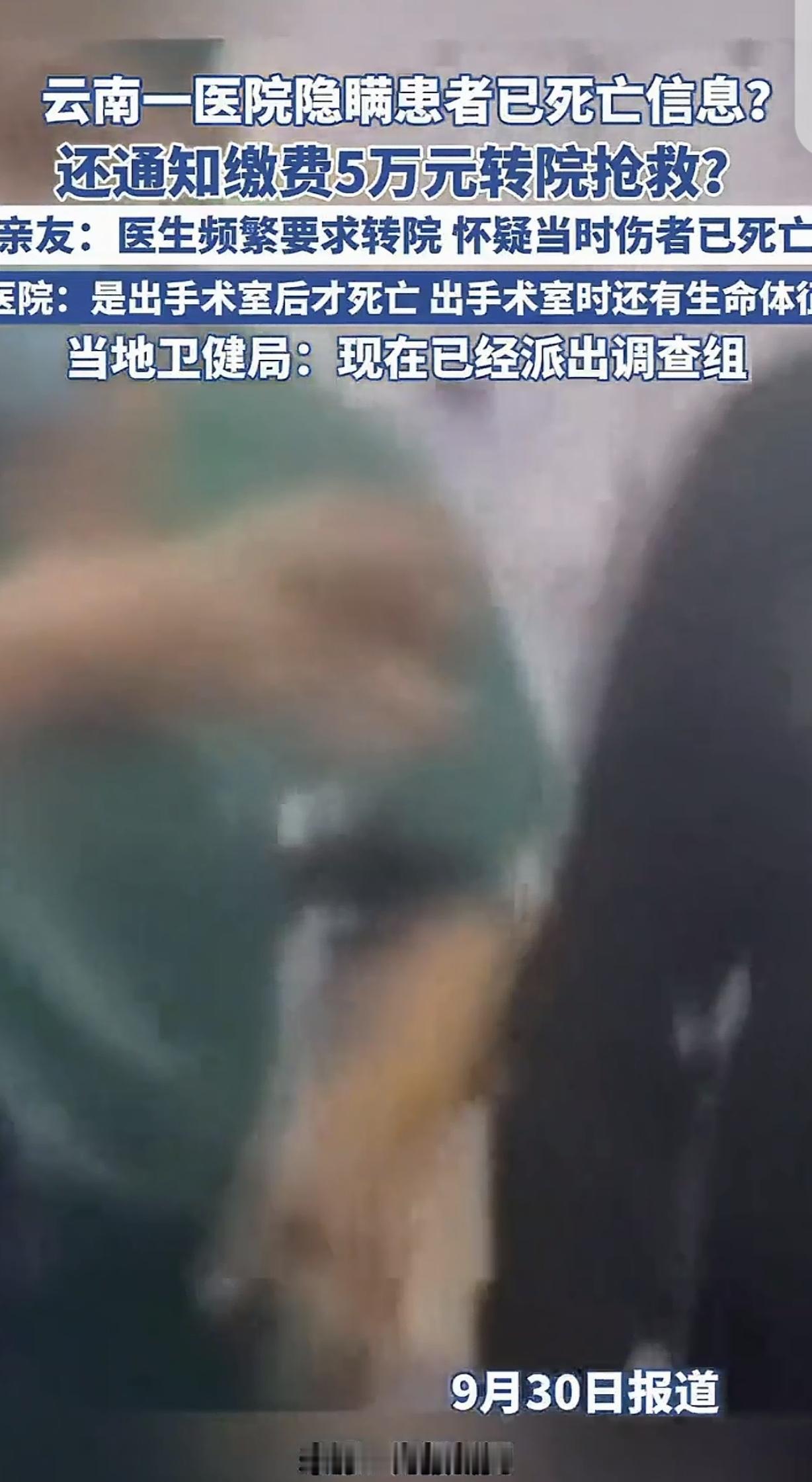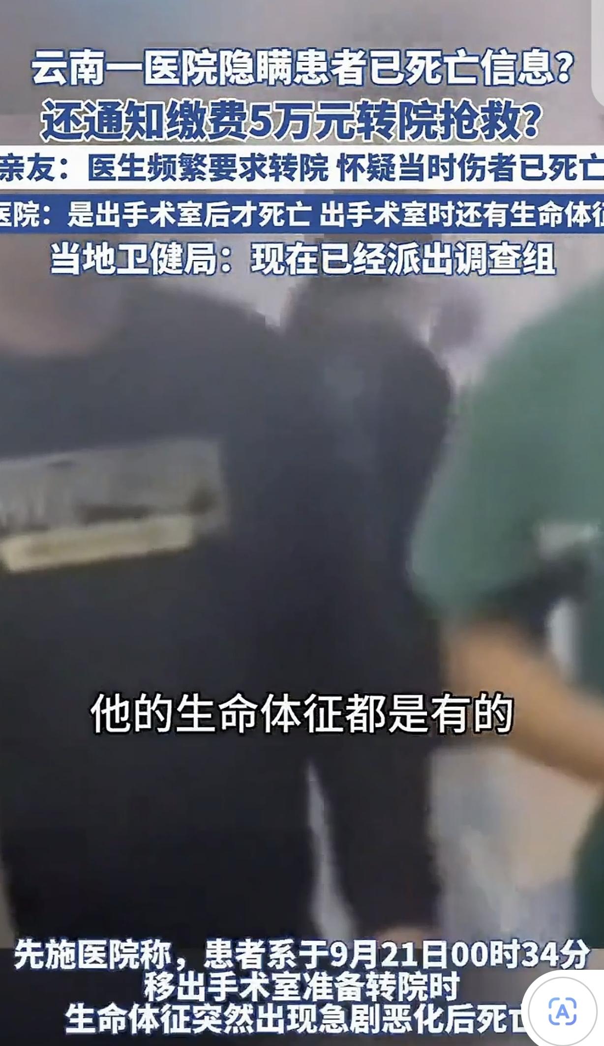 云南,一男子在工地意外受伤,可医院却隐瞒男子已死亡的消息,还通知缴费50000元转院抢救,事情败露后,医院狡辩:做完手术还活着,是出手术室才死亡的。 “人没了还被要求交5万转院抢救,这医院是把我们当傻子耍吗?”近期,云南宣威一起工地受伤男子的医疗事件,在网络上炸开了锅,把医患之间的信任推到了舆论的聚光灯下。 故事的主角是贵州威宁的一名普通工人,他在工地劳作时意外遭遇重伤,由于当地医疗条件有限,家属心急如焚地将他跨省送往云南宣威先施医院,盼着这里的医生能妙手回春,可谁也没想到,这场生命的接力,最后却充满争议。 家属在短视频平台发布的内容里满是愤懑:患者其实已经死亡数小时,医院却刻意隐瞒,还堂而皇之地通知他们缴纳5万元费用,说要转院继续抢救。 “医生一个劲催转院,我们越想越不对劲,后来才发现人可能早就没了!”家属的质疑在网络引起了巨大的舆论,他们觉得医院是在拿逝者做文章,吃相难看。 而医院给出的版本则截然不同,院方表示,患者被推出手术室准备转院时,生命体征突然急剧恶化,医护人员当即展开了全力抢救。“我们的医护人员真的是拼尽全力了,奈何最终还是没能挽回患者生命。” 同时,医院还澄清,家属预交的55000元费用,全部是2025年9月20日22时11分之前,用于支持抢救和手术的预付款,并非后续产生的费用。 更值得注意的是,医院提到抢救过程中,现场有随行人员聚集并阻挠,严重干扰了正常的抢救秩序,这让本就危急的抢救工作雪上加霜。 目前,当地卫健局已经介入调查,关于事件的真相,所有人都在等待一个权威且公正的结论。 此事在网上发酵后,网友们的评论也是炸开了锅: 有网友直言:“医疗行业的信任本来就很脆弱,这种事要是真的,那以后谁还敢相信医院?必须一查到底!” 也有网友保持着理性:“现在双方各说各的,都不能全信,还是等官方调查结果吧,说不定事情背后还有别的隐情。” 透过这件事,咱们也能看明白不少事。医疗信息的公开透明是医患之间的“连心桥”,患者家属本就处于焦虑之中,一旦信息不透明,信任的堤坝很容易就被冲垮。 遇到医疗纠纷,双方都该冷静下来,通过正规的渠道去解决,情绪化的对抗只会让问题变得更复杂,还有就是,相关部门的及时介入和公正调查太重要了,这是还原事情真相的关键,只有真相明了,才能让各方都心服口服。 那么你们怎么看待这件事呢?欢迎在评论区说说你们的看法吧!