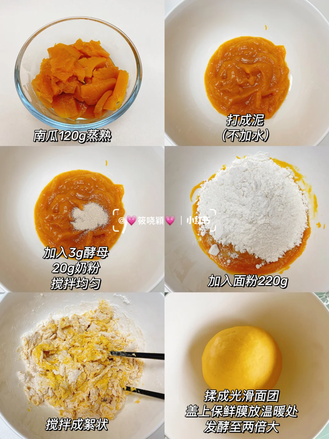 1⃣️南瓜蒸熟打成泥,加酵母奶粉搅拌均匀