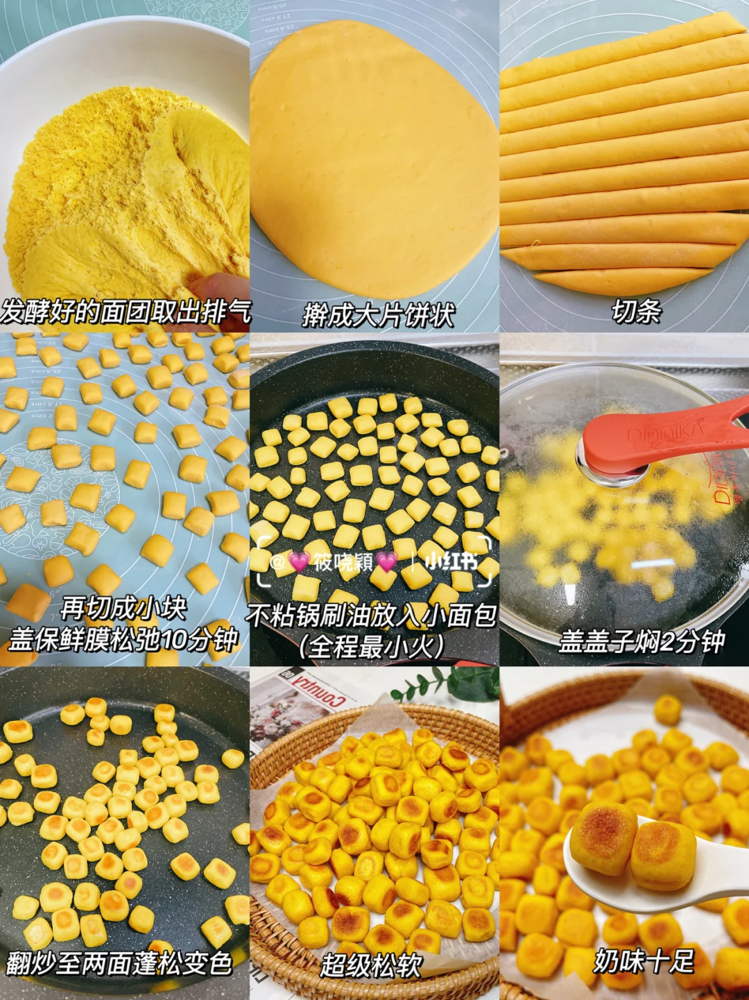 4⃣️不粘锅刷油,放入小面包,盖盖子焖2分钟,全程最小火,翻炒或者晃动锅子至小面包蓬松变色~