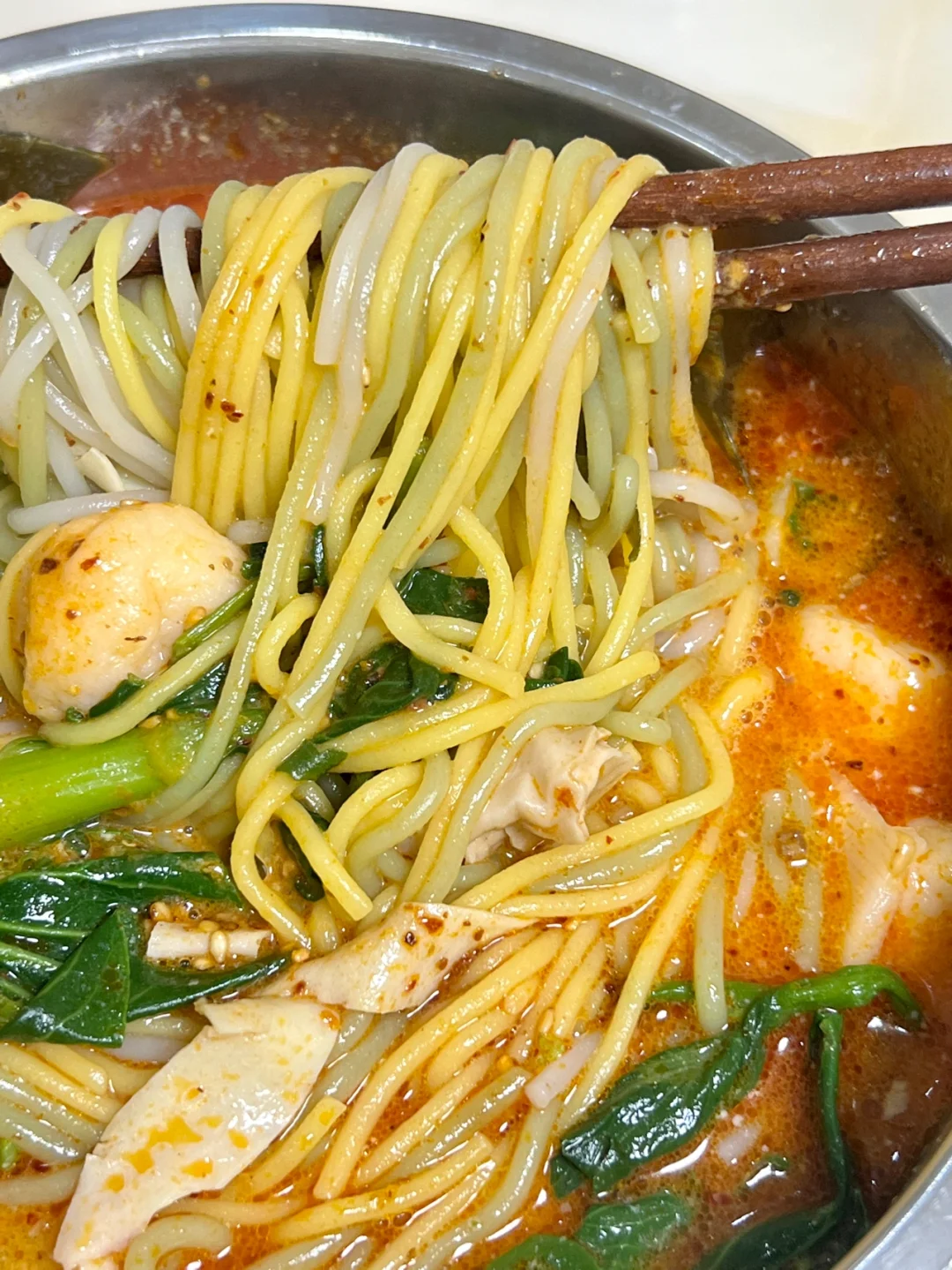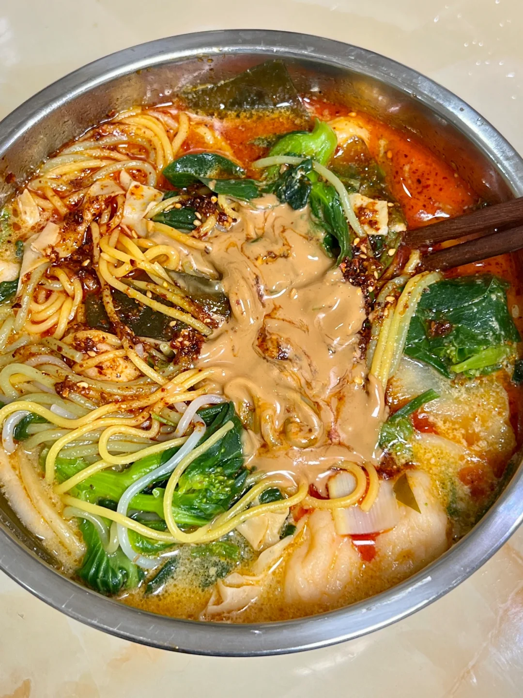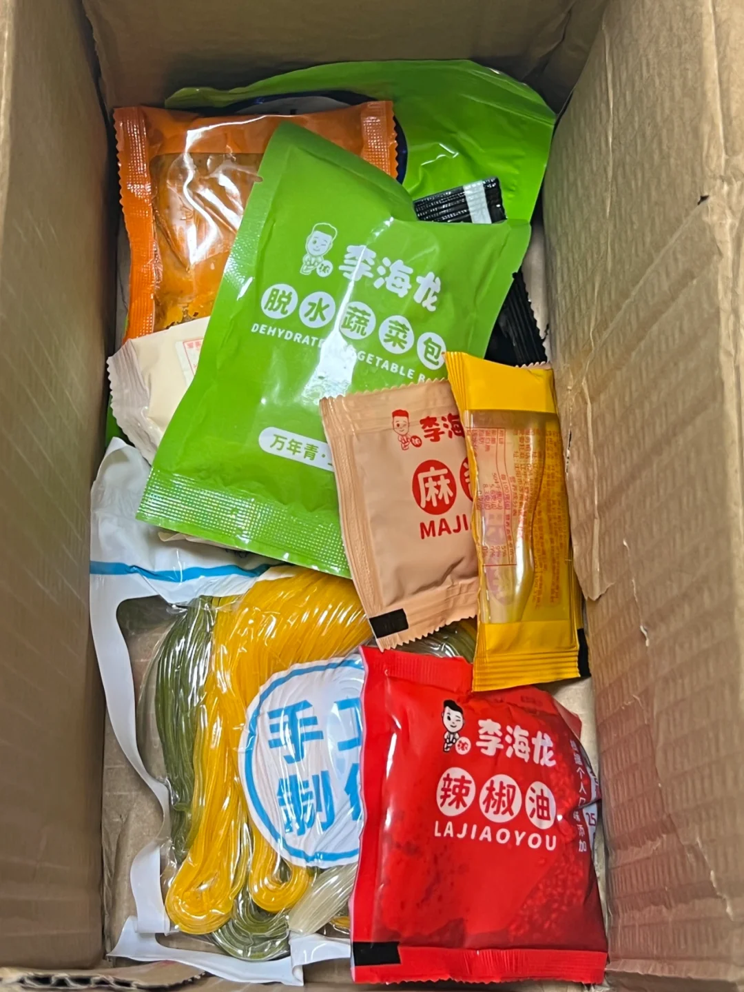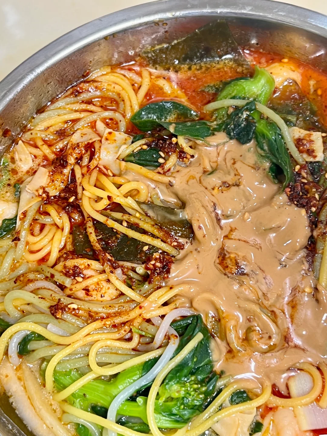 这个速食自带的料是真的多!! 完全不用加料,直接煮! 蔬菜包里种类还挺齐全的~ 三种颜色的面,煮完之后黏糊糊的,很有嚼劲! 自带奶粉、辣油、麻酱!加一起搅拌! 酸酸辣辣还有点回甜!真的太巴适了~ 拼多多