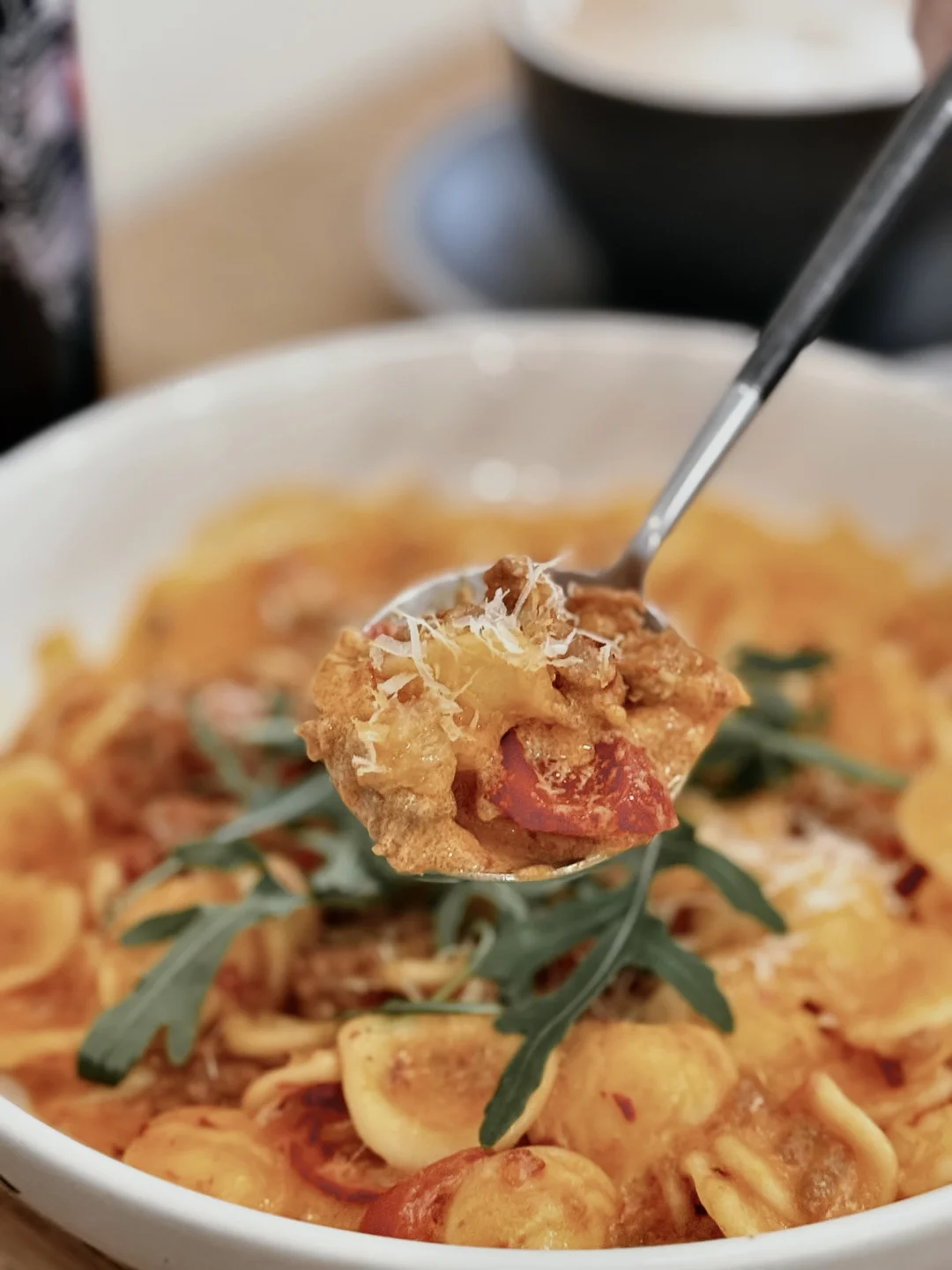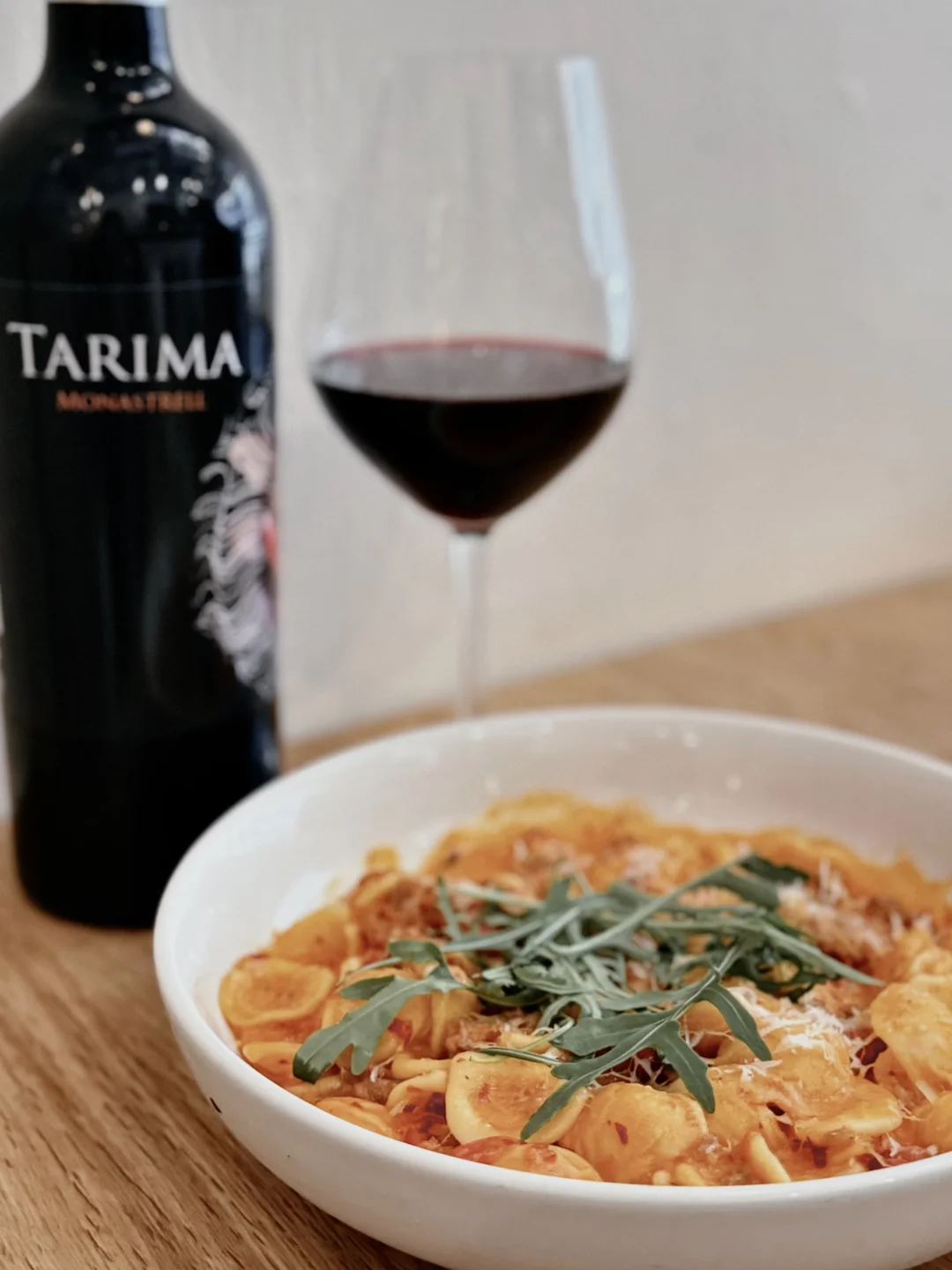 手工猫耳朵面Q弹到惊艳!辣肉酱奶香浓郁,帕玛森芝士碎撒落如雪,每颗「耳朵」都挂满酱汁,亚洲胃也疯狂。搭配Tarima紅酒🍷果香浓郁,单宁细腻柔滑,淡淡黑莓香气,口感圆润饱满。