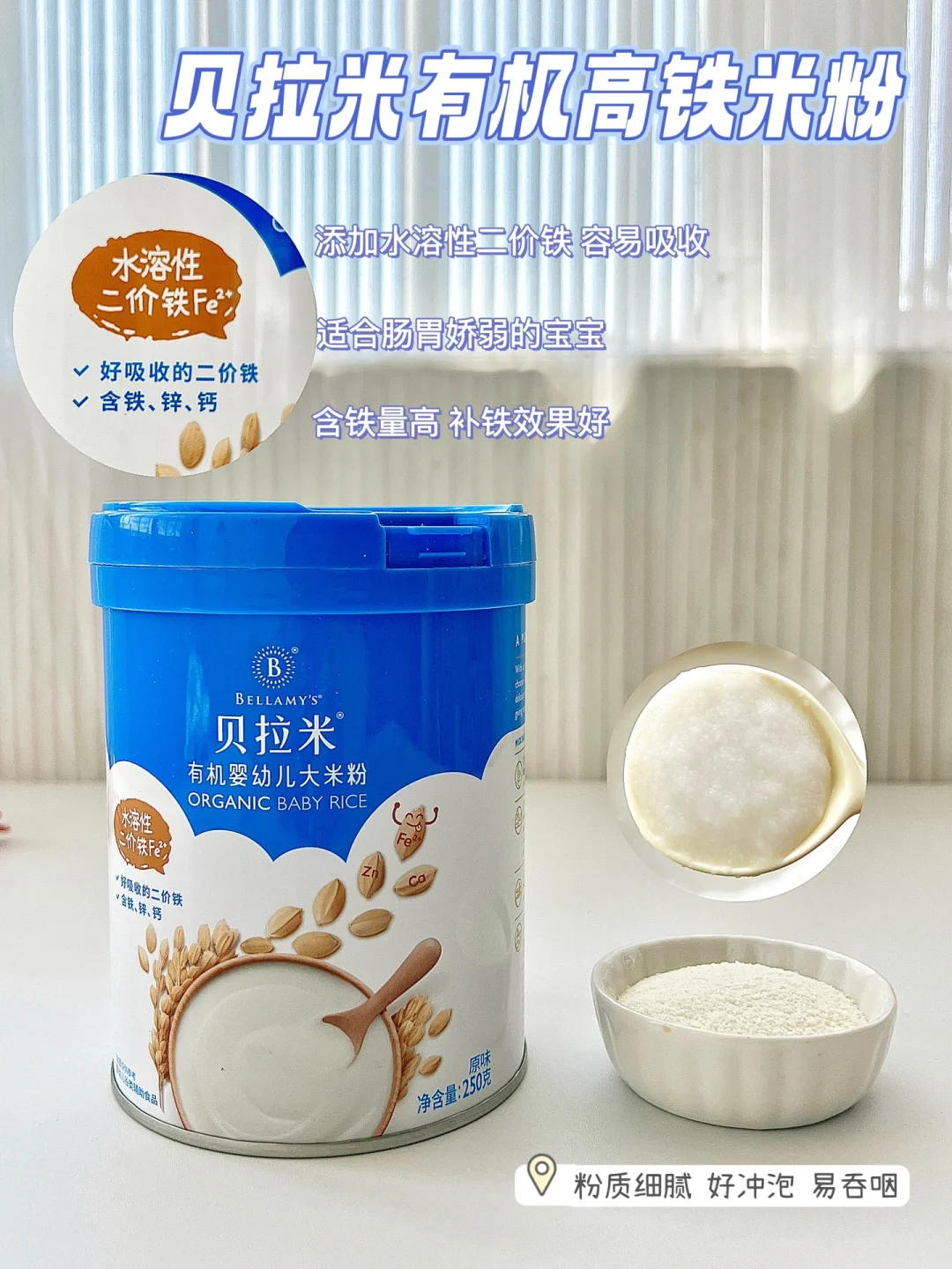 🔸好多宝妈都知道,贝拉米是19年来专做有机产品的大品牌,而且贝拉米这款高铁米粉选用的是世界卫生组织WHO优选铁剂——水溶性二价铁,给大家科普下,水溶性二价铁相比一般二价铁能直接溶于水,对宝宝来说要更好吸收!我查了下,贝拉米这款是选用“水溶性二价铁“的高铁米粉,而且每100克贝拉米米粉含铁量高达5.2毫克,补铁效果真的是杠杠的~