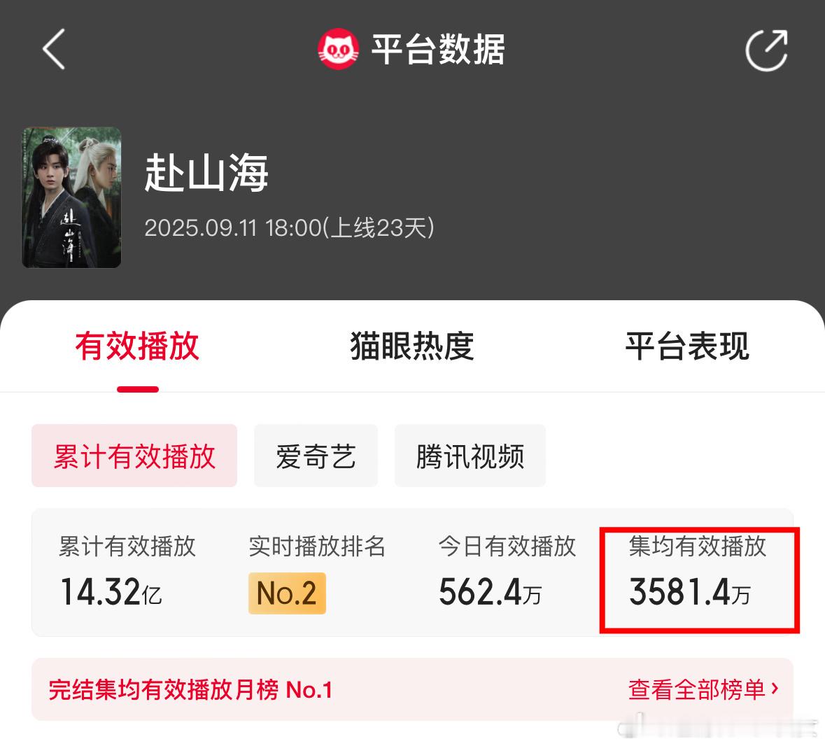 赴山海上线23天,猫眼完结榜剧集年榜已经第八名了,目前有效集均已3500万+,国庆假期下沉市场很多新观众推荐这部剧,都在口口相传,赴山海剧情好打戏强立意高值得安利。