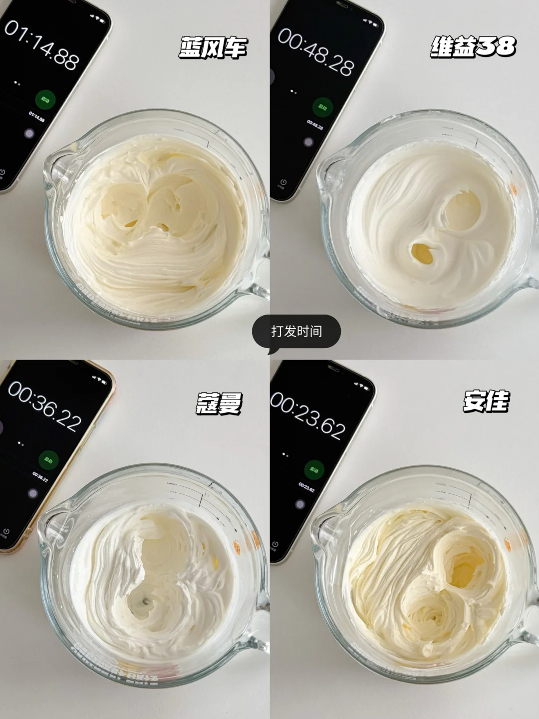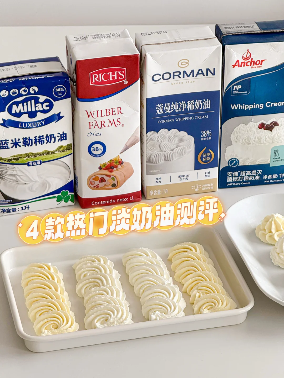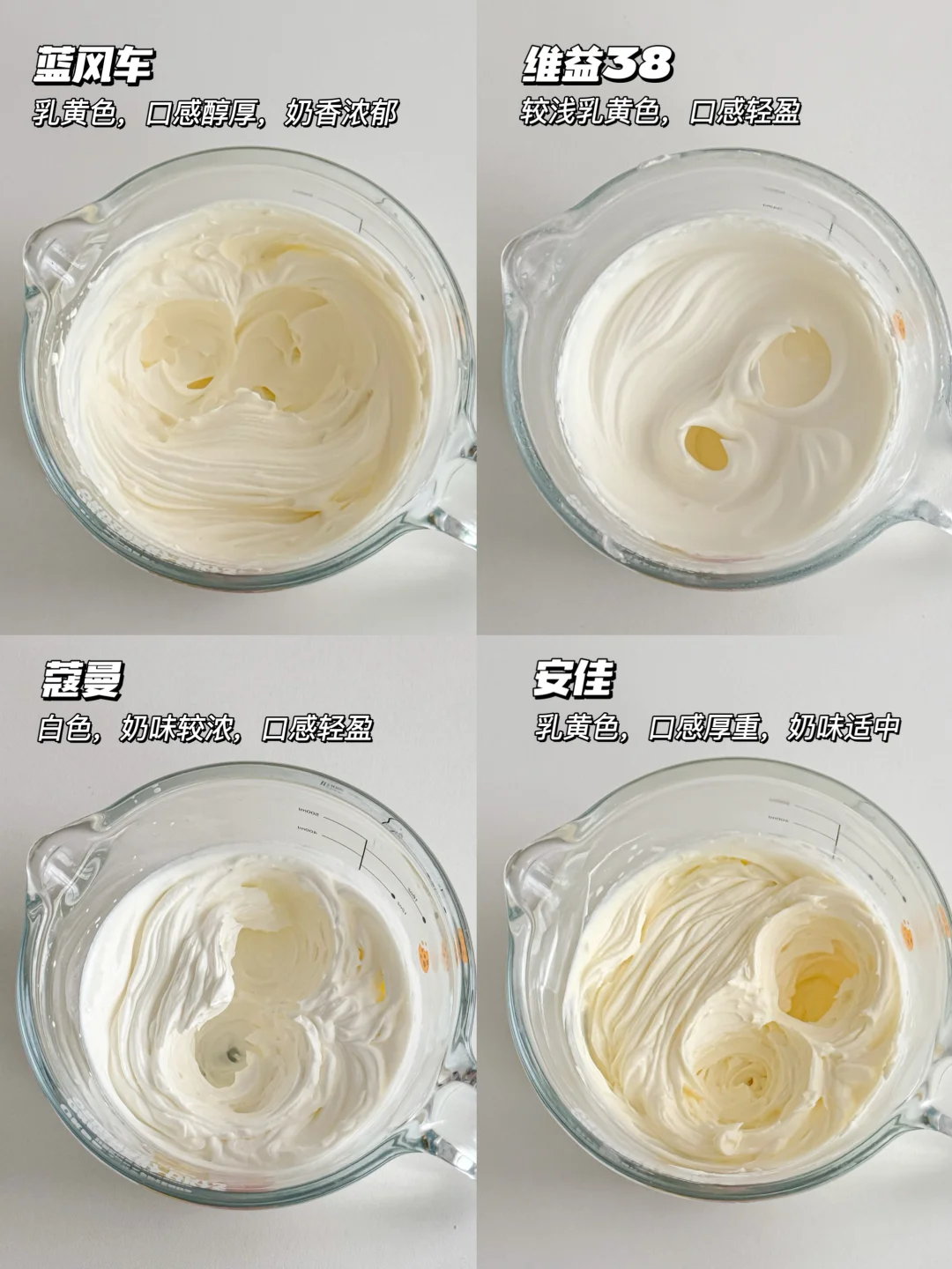 经常宝问我用的啥淡奶油,也想自己做甜品 其实私下啥都用过,不同品牌在打发和口味上都有明显区别 这次集齐了四款淡奶油,多维度做个详尽测评和总结 供大家选择! - 🥛【原产地& 乳脂含量&价格】 1️⃣蓝风车:英国 乳脂含量38%(9个月)💰50.8-54.8 2️⃣维益38: 西班牙 乳脂含量38% (9个月) 💰46-48 3️⃣蔻曼:国产 乳脂含量38% (3个月) 💰38.8-41.8 4️⃣安佳:新西兰 乳脂含量35% (9个月) 💰41.8-44.8 【乳脂含量越高口感更浓郁醇厚。经比较,蔻曼价格相对便宜,乳脂含量高】 · 🔖【产品成分】 1️⃣蓝风车:稀奶油 2️⃣维益38: 稀奶油 3️⃣蔻曼:生牛乳 4️⃣安佳:稀奶油、乳固体、乳化剂、稳定剂 【除安佳外,其他三款成分只有稀奶油或生牛乳,蔻曼配料纯净自然】 · 🕐【打发时间】 1️⃣蓝风车:1分15秒 2️⃣维益38: 48秒 3️⃣蔻曼:36秒 4️⃣安佳:23秒 打发时间:安佳>蔻曼>爱真38>蓝风车,打发时间越短,烘焙更节省时间 PS:打发时间会因室温、量、打发程度等因素影响发生改变,仅供参考 · 🩵【颜色对比】 1️⃣蓝风车:乳黄色,口感醇厚,奶香浓郁 2️⃣维益38: 较浅的乳黄色,口感轻盈,浓郁香醇 3️⃣蔻曼:白色 4️⃣安佳:乳黄色,口感略厚重,奶味适中 【奶油不偏色,适合做调色奶油】 · 🤍【稳定性对比】打发好的奶油30度放置1小时 1️⃣蓝风车:花纹保持较好,底部轻微渗水 2️⃣维益38: 花纹保持一般,底部有些渗水 3️⃣蔻曼:花纹保持好,没有渗水 4️⃣安佳:纹路清晰,微渗水 稳定性:蔻曼>蓝风车>安佳>维益38 - 四款奶油各有千秋,不能从单一角度决定奶油好坏,大家可以根据自己的需求选择适合自己的淡奶油