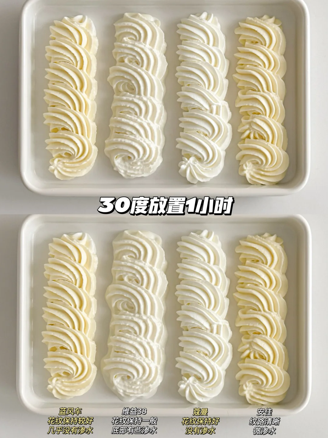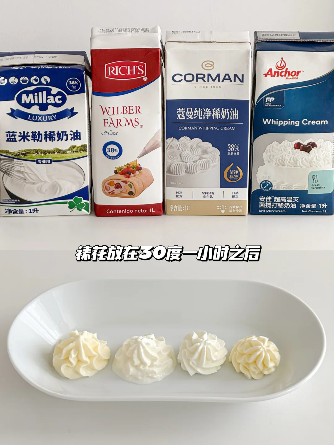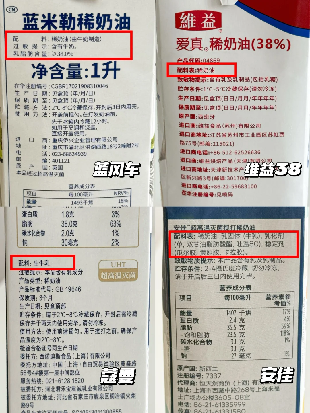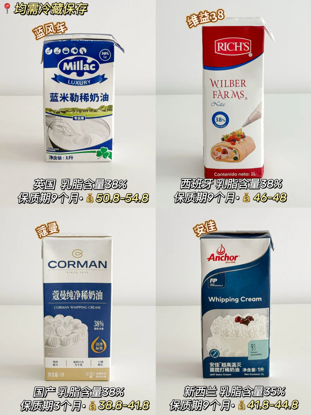 经常宝问我用的啥淡奶油,也想自己做甜品 其实私下啥都用过,不同品牌在打发和口味上都有明显区别 这次集齐了四款淡奶油,多维度做个详尽测评和总结 供大家选择! - 🥛【原产地& 乳脂含量&价格】 1️⃣蓝风车:英国 乳脂含量38%(9个月)💰50.8-54.8 2️⃣维益38: 西班牙 乳脂含量38% (9个月) 💰46-48 3️⃣蔻曼:国产 乳脂含量38% (3个月) 💰38.8-41.8 4️⃣安佳:新西兰 乳脂含量35% (9个月) 💰41.8-44.8 【乳脂含量越高口感更浓郁醇厚。经比较,蔻曼价格相对便宜,乳脂含量高】 · 🔖【产品成分】 1️⃣蓝风车:稀奶油 2️⃣维益38: 稀奶油 3️⃣蔻曼:生牛乳 4️⃣安佳:稀奶油、乳固体、乳化剂、稳定剂 【除安佳外,其他三款成分只有稀奶油或生牛乳,蔻曼配料纯净自然】 · 🕐【打发时间】 1️⃣蓝风车:1分15秒 2️⃣维益38: 48秒 3️⃣蔻曼:36秒 4️⃣安佳:23秒 打发时间:安佳>蔻曼>爱真38>蓝风车,打发时间越短,烘焙更节省时间 PS:打发时间会因室温、量、打发程度等因素影响发生改变,仅供参考 · 🩵【颜色对比】 1️⃣蓝风车:乳黄色,口感醇厚,奶香浓郁 2️⃣维益38: 较浅的乳黄色,口感轻盈,浓郁香醇 3️⃣蔻曼:白色 4️⃣安佳:乳黄色,口感略厚重,奶味适中 【奶油不偏色,适合做调色奶油】 · 🤍【稳定性对比】打发好的奶油30度放置1小时 1️⃣蓝风车:花纹保持较好,底部轻微渗水 2️⃣维益38: 花纹保持一般,底部有些渗水 3️⃣蔻曼:花纹保持好,没有渗水 4️⃣安佳:纹路清晰,微渗水 稳定性:蔻曼>蓝风车>安佳>维益38 - 四款奶油各有千秋,不能从单一角度决定奶油好坏,大家可以根据自己的需求选择适合自己的淡奶油