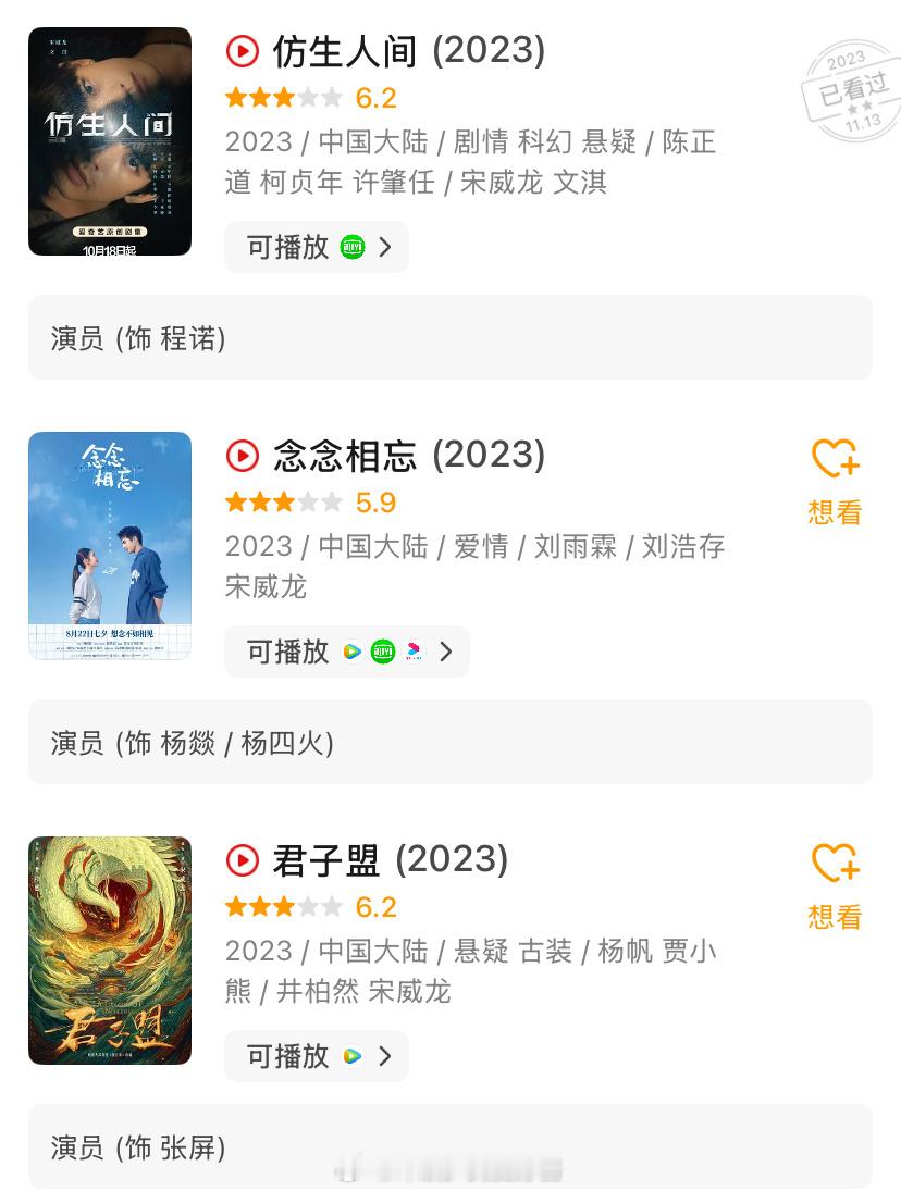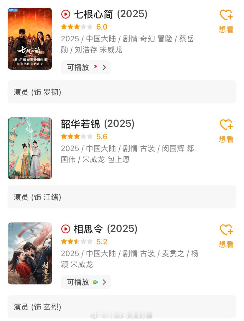最近三年最惨的电视剧男演员应该就是宋威龙了,2023年播了《君子盟》《念念相忘》(电影)《仿生人间》,2025年上半年已经播完《相思令》《韶华若锦》《七根心简》,基本没有一部剧有水花。