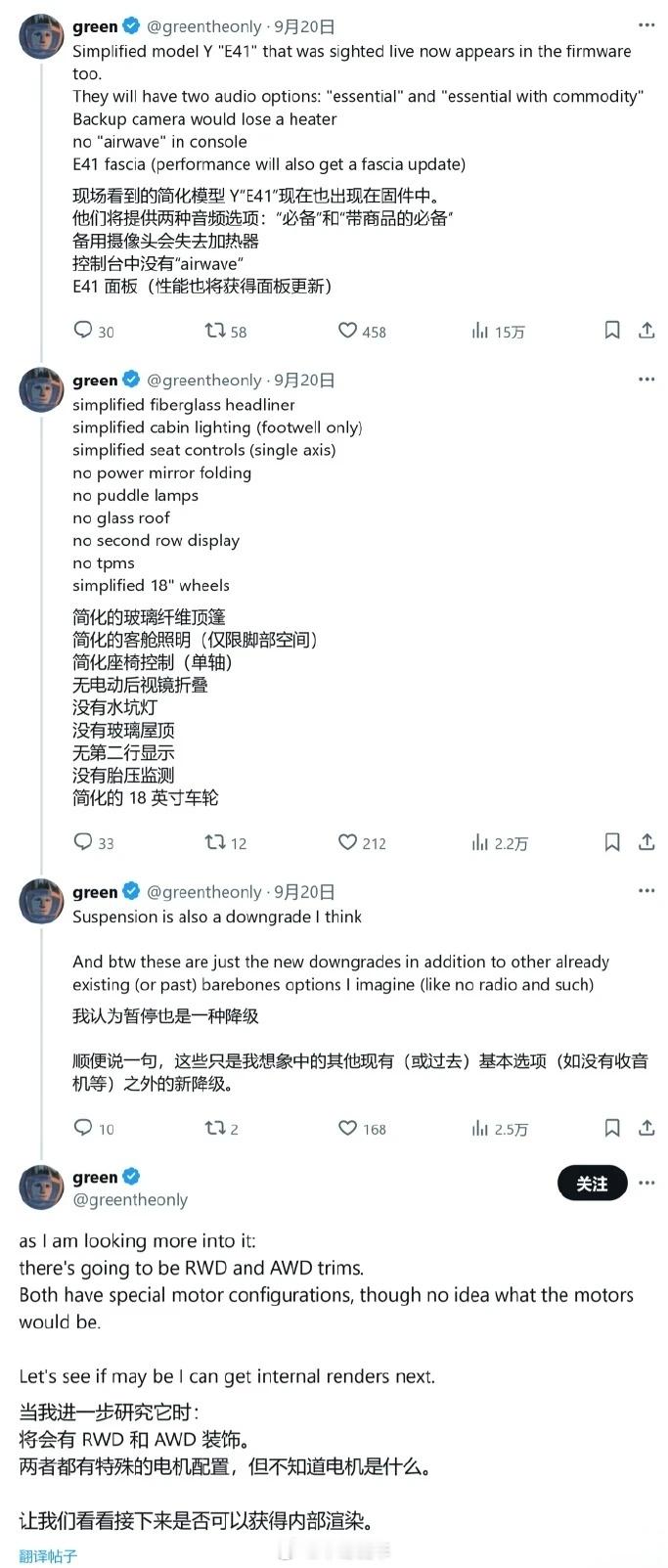全车上下取消了多达12项配置:无全景天窗 中控屏改为15.4吋 轮毂18吋 悬挂改成降级悬挂配置 动力会更差些电池要更小一点[捂嘴哭]