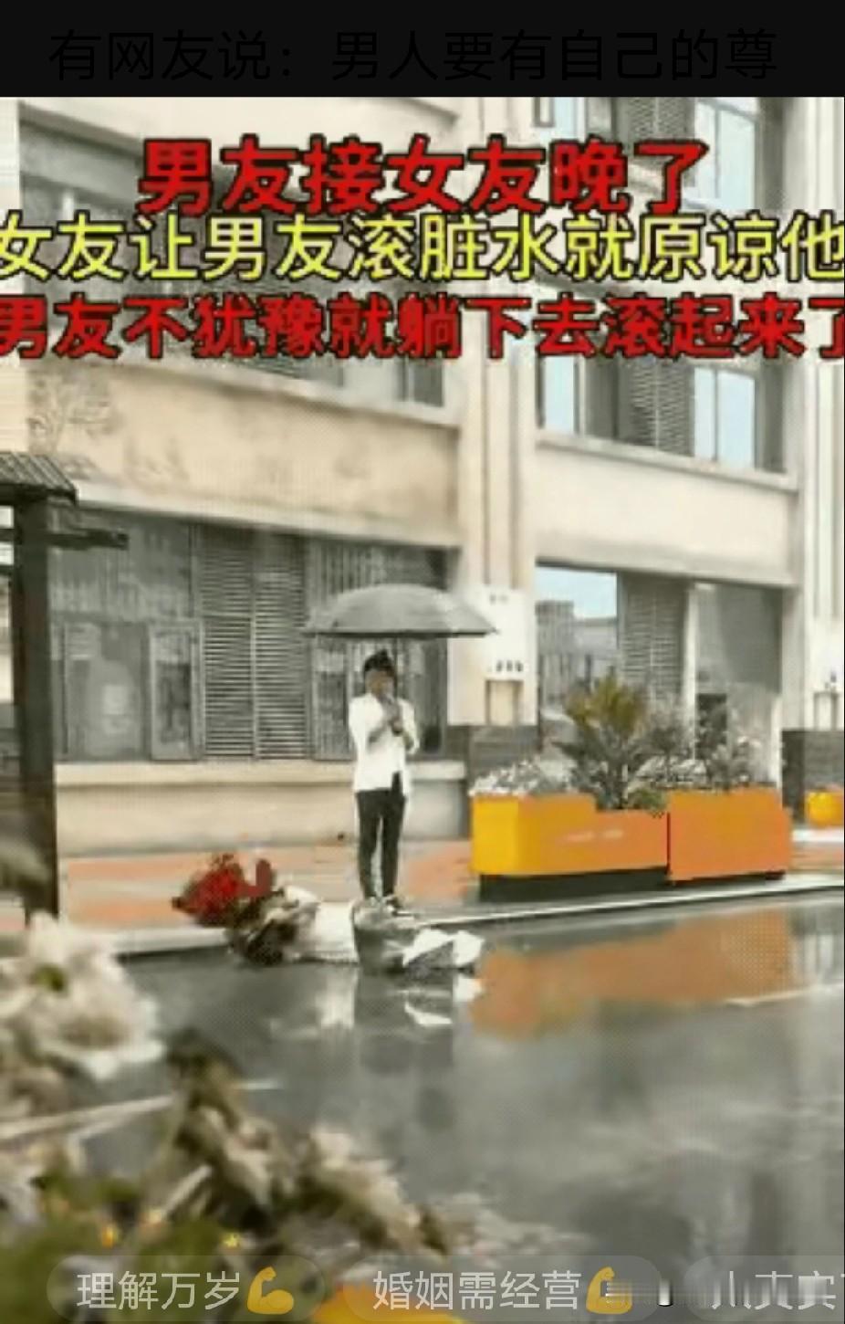 女子让男友雨中打滚求原谅,是爱情考验还是尊严践踏? 女子让男友去接她,男友想给女子一个惊喜,就去买了一束鲜花。这样一来就比约定接女子时间晚到了一会。谁料女子竟不依不饶,哪怕跪下献花给她也不行,非要男友在雨水地上打个滚她才肯原谅。 路边积水映着昏黄路灯,男子站在雨水中犹豫片刻。他看着女友铁青的脸,慢慢蹲下身,整个人躺进混着泥泞的水洼里。雨水瞬间浸透他的衣服,周围等车的人群投来诧异目光。他真的翻滚起来,从路这边滚到那边,像个失去尊严的木偶。女子举着手机录制视频,嘴角终于有了一丝笑意。 这个令人心酸的场景让人不禁思考:爱情何时变成了这种单方面的屈辱?男友买花本是表达爱意,迟到也并非故意。他却需要通过践踏自尊来换取原谅。类似的情节在不同城市上演过,四川街头曾有个张先生,同样因为约会迟到被女友要求“滚开”,他选择用滑稽的翻滚逗笑女友。江苏的王先生也有过几乎相同的经历。 为什么有些人习惯用伤害对方的方式来验证爱情?表面看是任性撒娇,深处却暴露了关系中的权力失衡。健康的爱情应该建立在相互尊重的基础上,而不是一方不断妥协、另一方肆意妄为。那个在雨中翻滚的男子,也许太害怕失去这段感情。但这种恐惧换来的不会是真正的爱情,只会是更扭曲的控制欲。 感情中最怕的就是把对方的付出当成理所当然。成年人的世界里有太多不得已,加班、堵车、突发状况,迟到二十分钟真的不算什么大事。比起强迫对方在雨地里打滚,两个人更需要的是互相体谅和理解。 有些女生考验男友是出于安全感不足,总想证明自己在对方心中的地位。但真正的爱情不需要通过践踏尊严来验证。那些当街让人难堪的行为,已经超出了考验的范畴,变成了情感勒索。好的感情应该让双方都感到舒适自在,有各自的空间又彼此依赖。 看着男子浑身湿透爬起来,还要陪着笑脸问女友“现在可以了吗”,这种关系早已失去平衡。爱情不是谁征服谁,而是两个独立个体的相互陪伴。如果一段感情让你必须放弃尊严才能维持,也许它本来就不值得继续。 每个人在爱情中都该保留底线。毫无原则的妥协只会让关系走向更扭曲的方向。真正爱你的人不会让你在泥泞中打滚,她会把你拉起来,为你撑伞。 各位读者你们怎么看?欢迎在评论区讨论。