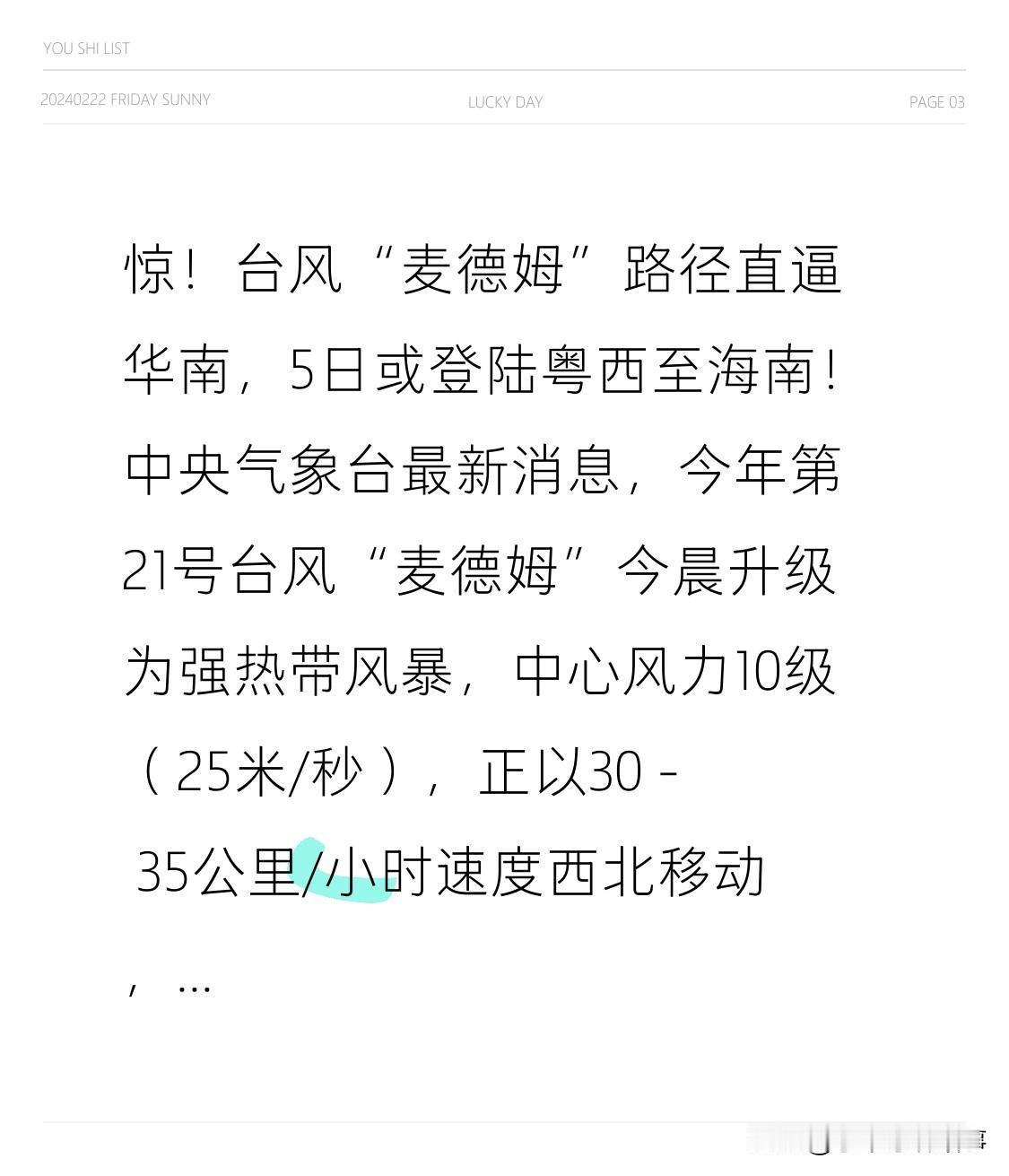 惊!台风“麦德姆”路径直逼华南,5日或登陆粤西至海南! 中央气象台最新消息,今年第21号台风“麦德姆”今晨升级为强热带风暴,中心风力10级(25米/秒),正以30 - 35公里/小时速度西北移动,3日下午入南海,5日白天或强台风级(14 - 15级)登陆广东西部至海南岛东部沿海。受影响,南海将现11 - 13级大风,海南、广东沿海风雨增强。国庆出行警惕,海上作业船只回港避风!