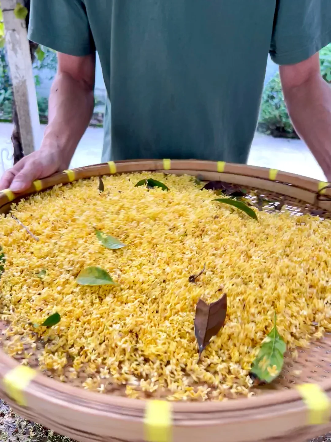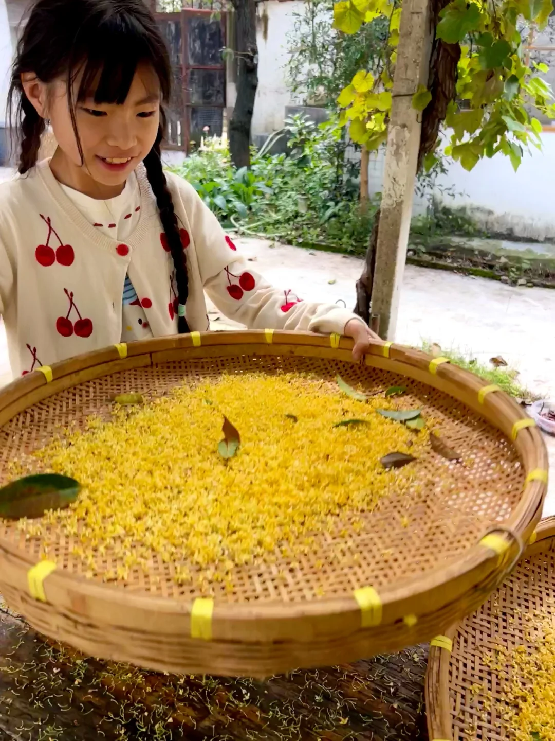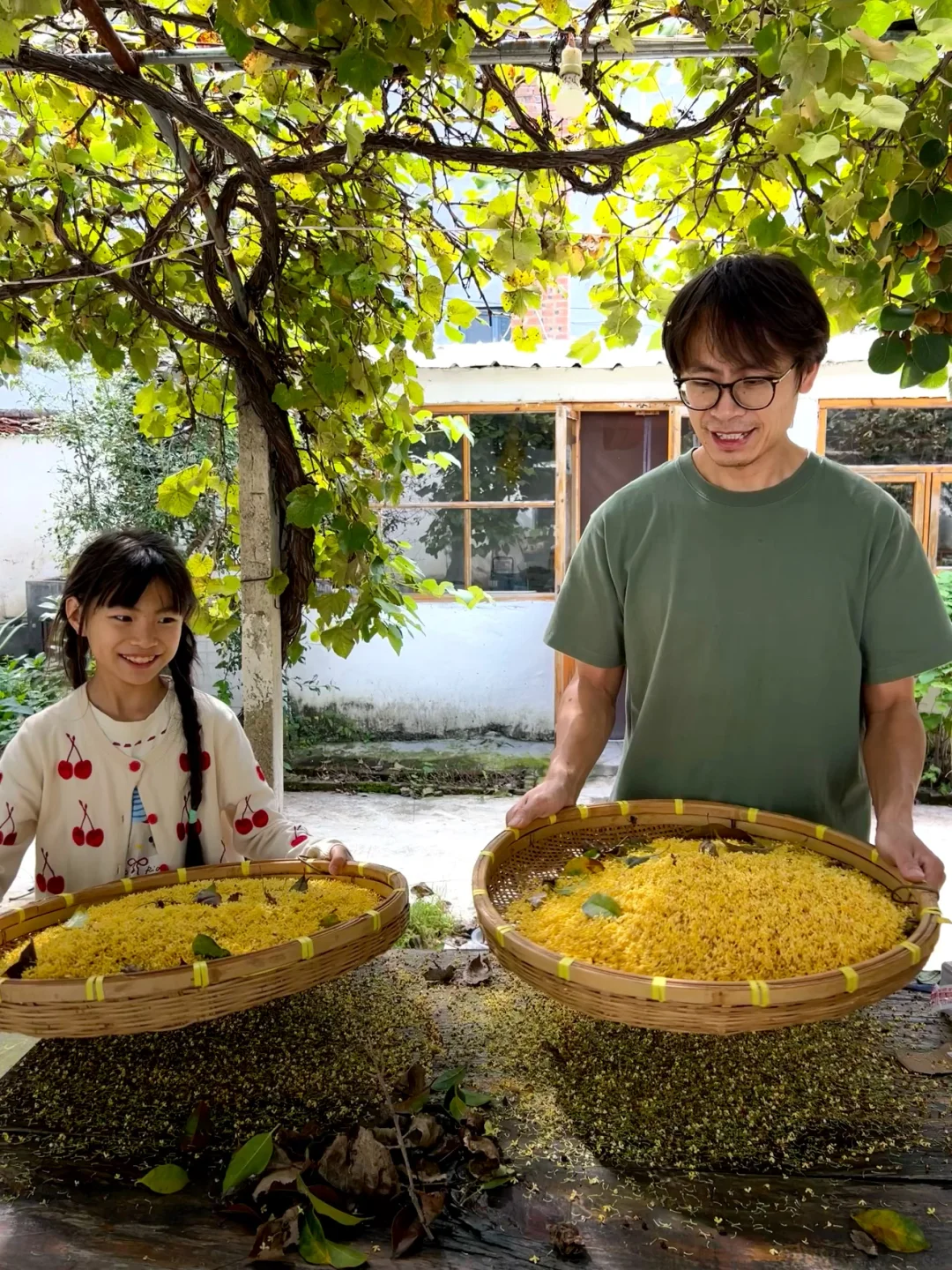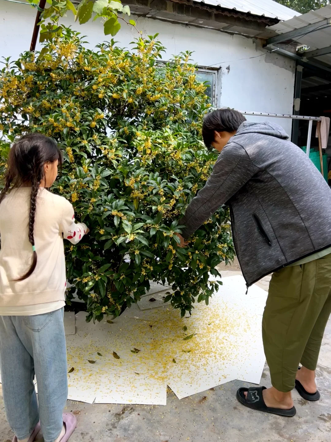 结果今天一出太阳,他还是迫不及待和孩子一起收起了花,然后烘烤储存干桂花…一段忙活…