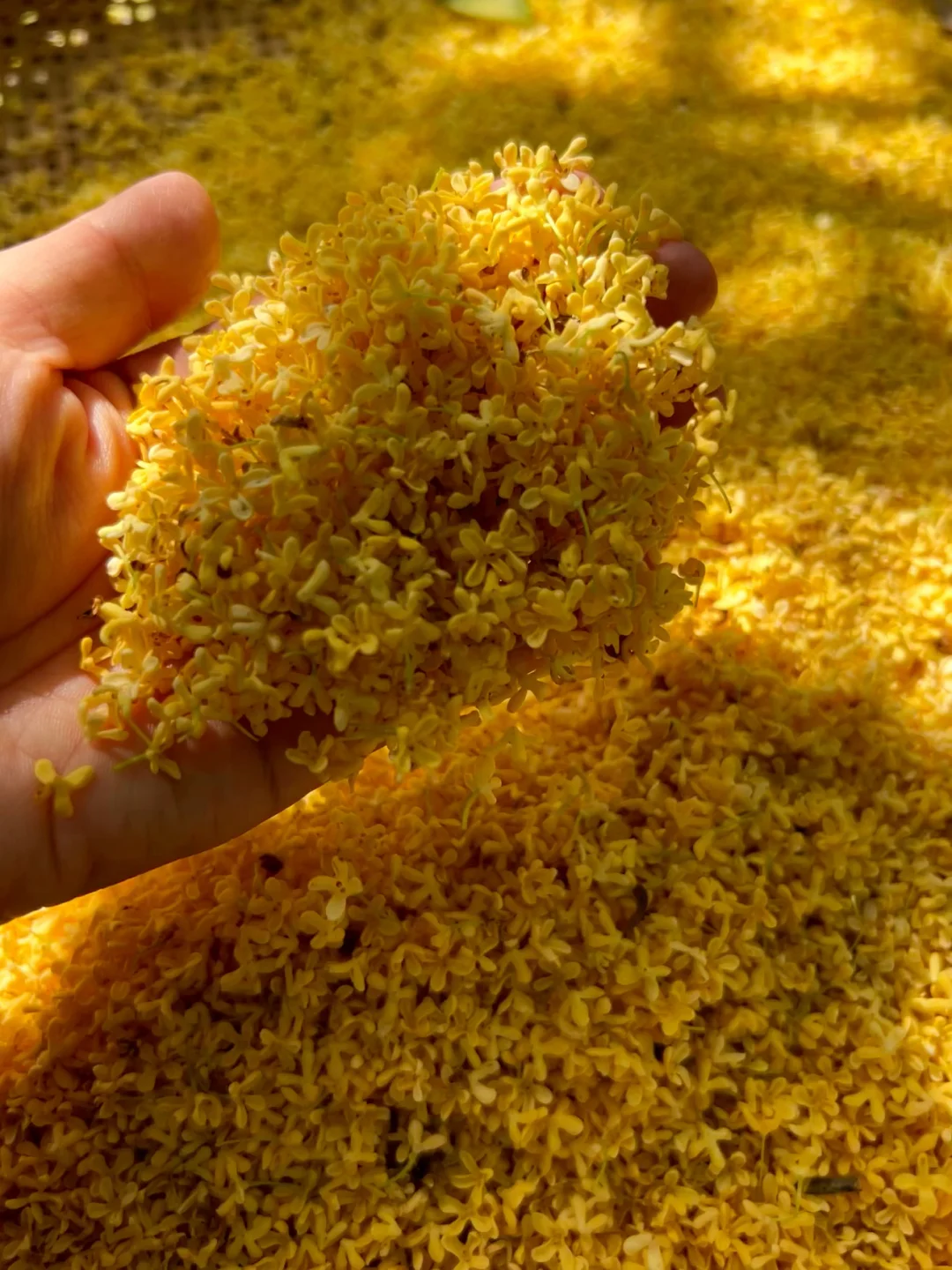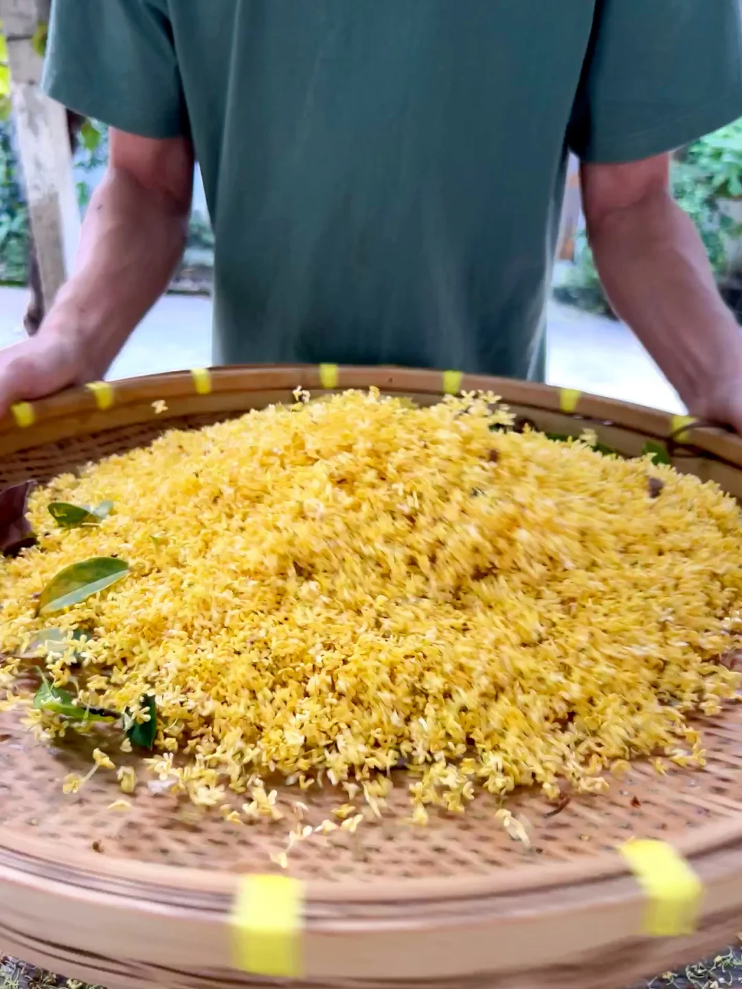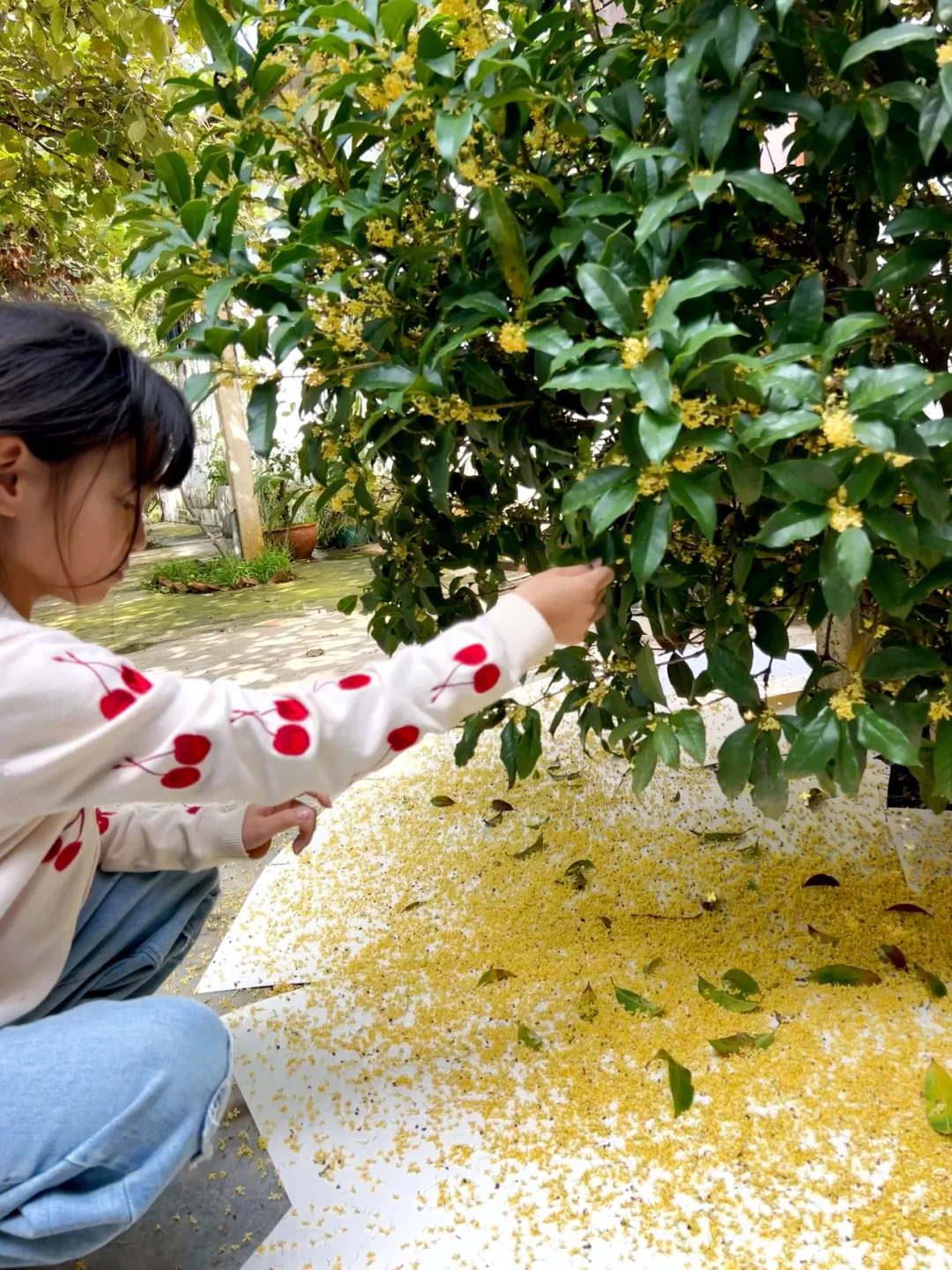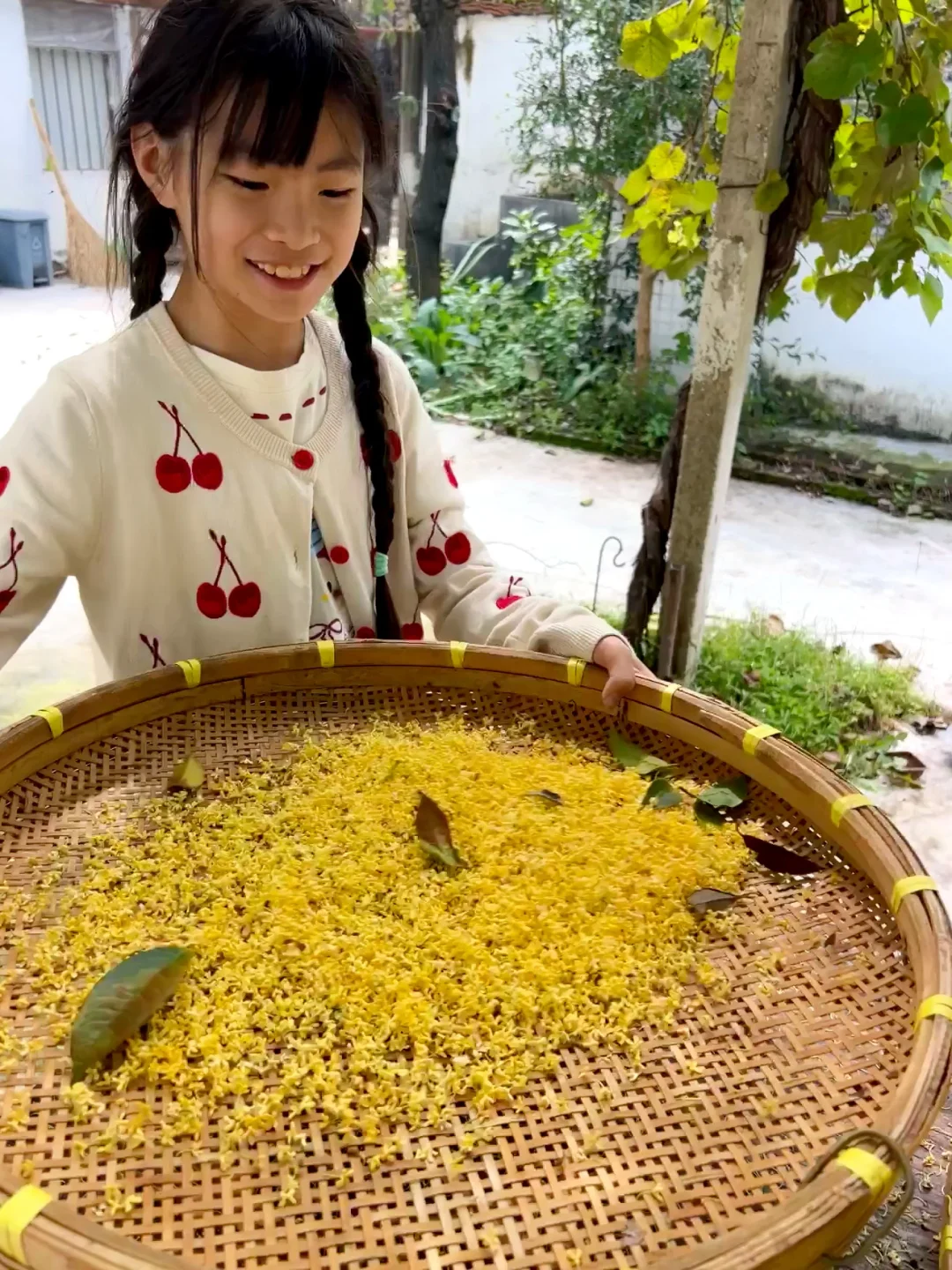结果今天一出太阳,他还是迫不及待和孩子一起收起了花,然后烘烤储存干桂花…一段忙活…