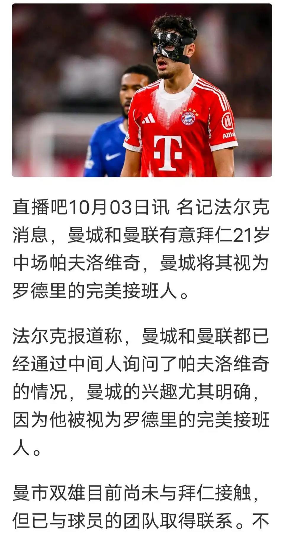 曼城已经在找罗德里接班人了。 拜仁球星21岁的帕夫洛维奇,据说很完美? 他本赛季只打进1球,最近几年加起来3球,但他是后腰不需要进攻数据。 上赛季20岁开始坐稳拜仁主力,也是拜仁青训出品,德转身价5500万欧元,钱不是问题,关键适应英超,曼城绝对买。[微笑]