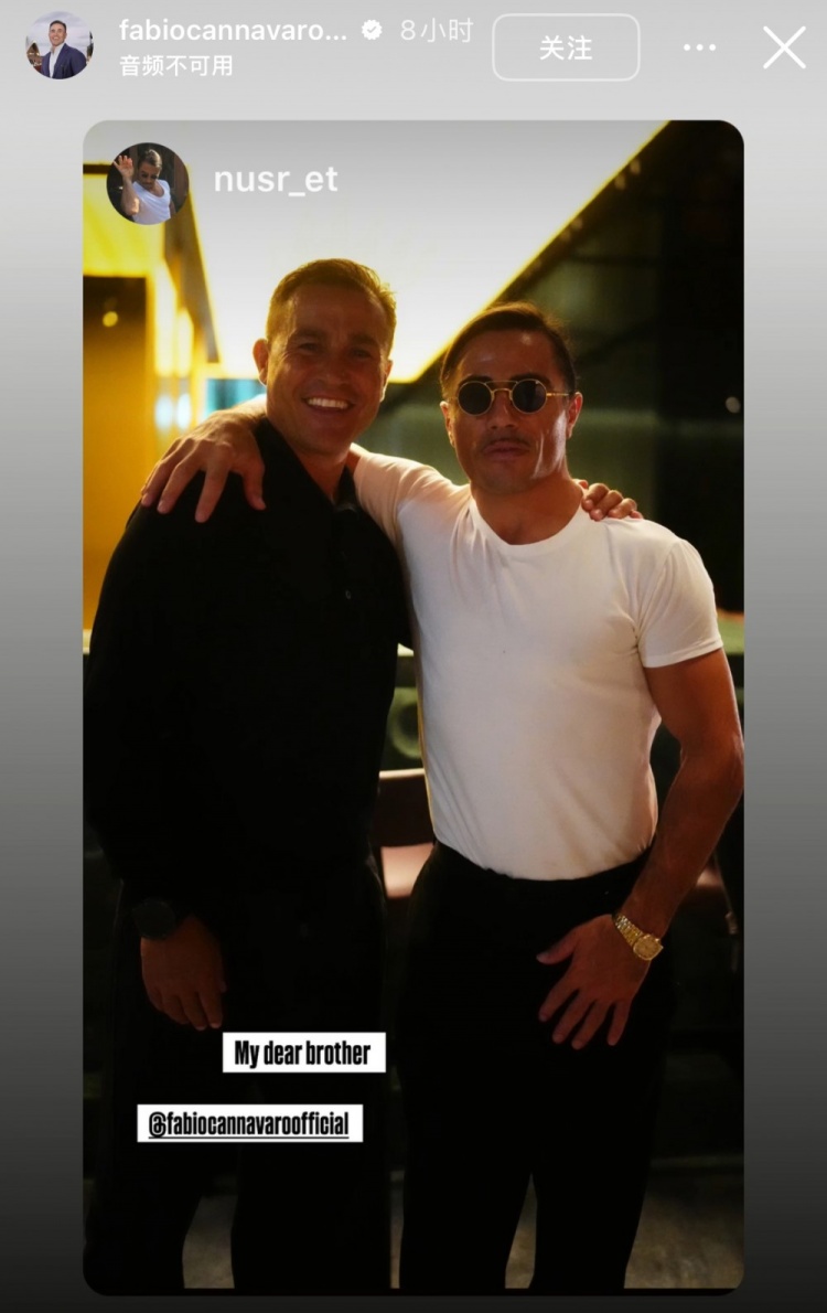 北京时间今天凌晨,卡纳瓦罗更新社媒,转发了网红“撒盐哥”社媒发出的两人合照,前者称呼卡纳瓦罗为“好兄弟”。照片中卡纳瓦罗依旧展现出标志性的笑容,看上去心情很好。