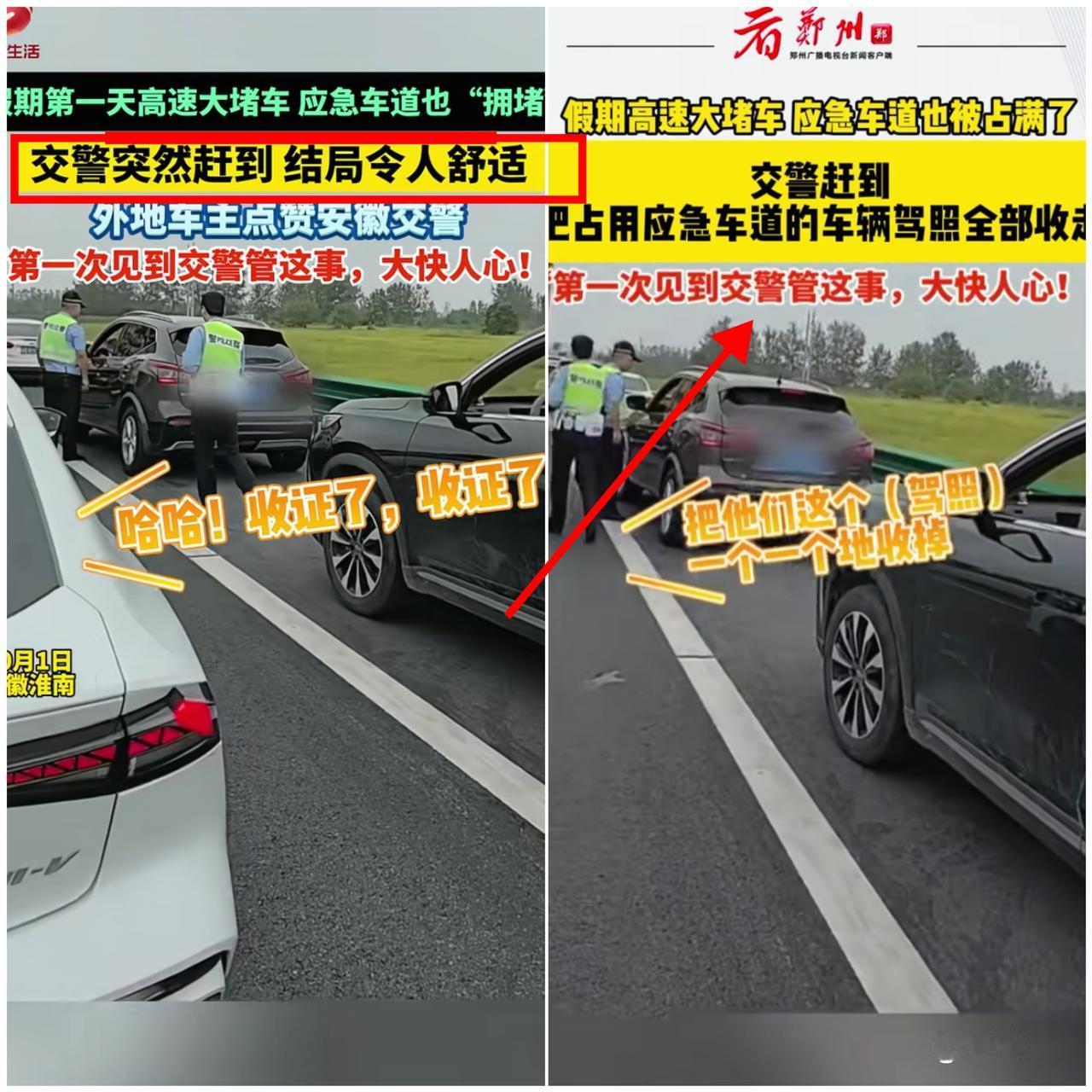 安徽淮南这大姐假期高速堵车,算是见着大快人心的一幕了! 她乖乖排队,可不少车主硬闯应急车道,结果交警一来直接收驾照,一摞驾照拿在手里,看着就解气! 别觉得占用应急车道是小事,那可是“生命通道”啊! 万一前面出事故要救急,救护车消防车被堵在后面,耽误的就是人命。 这次交警动真格,根本不是小题大做,而是给所有自私车主敲警钟! 规则不是摆设,你图的几分钟方便,可能堵死别人的生路。 现在好多人总抱着“别人走我也走”的侥幸,这次处罚就该让他们记牢:应急车道碰不得! 你们在高速上见过占用应急车道的吗? 要是遇到这种情况,你会选择举报还是只能无奈看着?