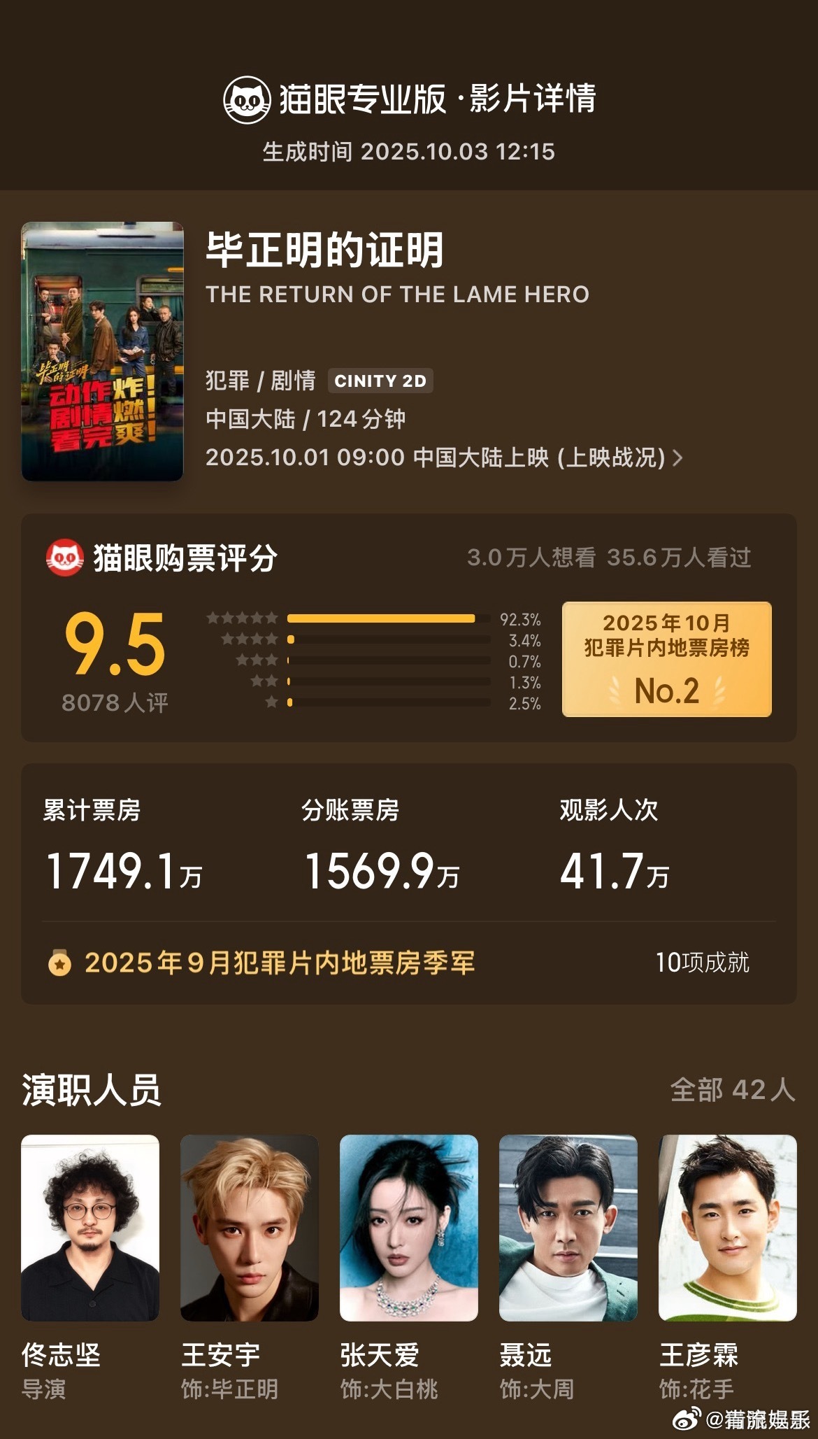 王源包场支持毕正明的证明据猫眼专业版云包场显示,包场支持国庆档电影《毕正明的