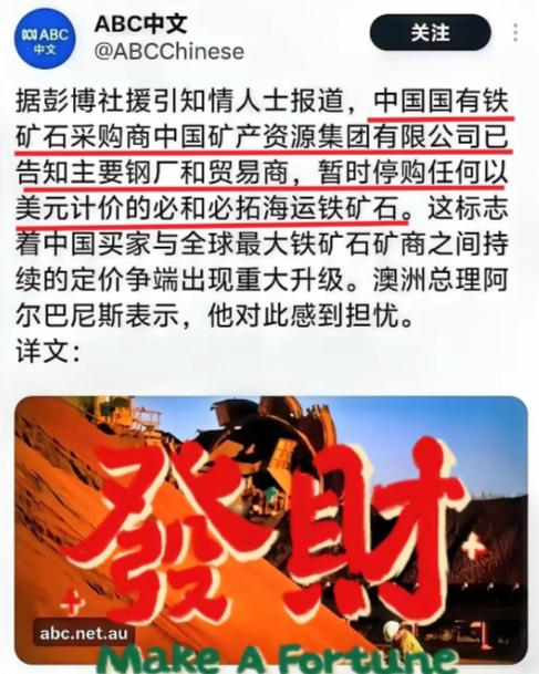 就在美国白宫宣告 10 月 1 日关门大吉的时候,中国给美国政府递上一份重磅大礼。 10 月 1 日 ABC 消息,中国矿产资源集团告知主要钢铁厂及贸易商,临时暂停采购任何以美元结算的必和必拓海运铁矿石,ABC 点评称,这意味着中国买家与全球最大铁矿石矿商间持续的定价纠纷迎来重大升级。 值得注意的是,过去几个月,中矿资源集团就曾对必和必拓旗下的“金布巴”铁矿产品发出过限购信号,而这次直接暂停的是更广泛的“美元计价采购”行为,目标已经不只是某个矿点,更是美元在全球大宗商品交易中的主导地位。 目前中方并未明确宣布是否接受以人民币结算的产品,但多家外媒认为,人民币定价已经是中国方面的“底线”,此举立刻在澳洲政商界引发震动,澳总理阿尔巴尼斯公开表示“希望出口通道不要受影响”,从“定价之争”变成“货币对抗”,这背后的意味可就不止铁矿石了,你觉得,中国这次出手是不是有点意思? 其实懂行的人一眼就能看明白,这不是中国临时起意的一锤子买卖,而是蓄谋已久的一步棋,从中矿资源集团的组建开始,中国就已经开始谋求在全球矿产供应链中掌握更多话语权,过去几十年,中国在铁矿石谈判桌上常年处于被动,面对必和必拓、力拓、淡水河谷这三大矿商,经常只能接受“先涨价再谈判”的尴尬,而这次以结算货币为突破口,不光让交易本身产生变量,更重要的是,把战线拉到了美元身上。 一旦未来中国主要的铁矿石交易都转向人民币结算,那美元在大宗商品市场的霸主地位会被撼动,这才是美国真正不愿看到的局面,有人说,这只是一场贸易摩擦,其实远不止,贸易只是一层皮,骨子里这是货币秩序的较量。 铁矿石、原油、大豆,这些大宗商品都是美元流通的“实际抓手”,一旦这些领域出现人民币结算规模化的趋势,美元的国际地位就会被实实在在地削弱,到时候,美债的吸引力会下降,美联储加息的“威慑力”也会逐步失效,从这点看,中国这步棋虽然下在铁矿石,但实际打击的是美元的脆弱神经。 当然,这种级别的操作,不可能不冒风险,中方此举很容易刺激市场情绪,尤其是澳大利亚和美国的政商界,如果美方选择反击,比如限制技术出口、金融制裁甚至打压人民币国际化通道,中国就得承担这一轮升级的代价,但不出手又不行,中国已经在美债上大幅减持,如果铁矿石、原油这些能源资源再不动手去美元化,人民币将永远难以跨入真正国际货币的行列。 美国这一轮政府停摆,某种程度也反映出他们财政掏空、债务爆炸的底色,当美元背后的国家机器开始频繁失灵,全世界都会寻找替代品,中国此时推动人民币结算,不是“硬顶”,而是“顺势”,尤其在这个节骨眼上,谁先敢下场,谁就有可能重塑游戏规则,当然结果谁也不能打包票,但可以确定的是,如果连试都不试,那永远只能看别人定规则。 现在的问题来了,如果未来中国真的全面转向人民币结算,你觉得澳洲这些矿商是会被迫接受,还是会联合反击?如果货币不是你的武器,就永远只能成为别人的靶子,你觉得,中国这次出手够不够狠?欢迎评论区聊聊你的看法。 参考资料:ABC