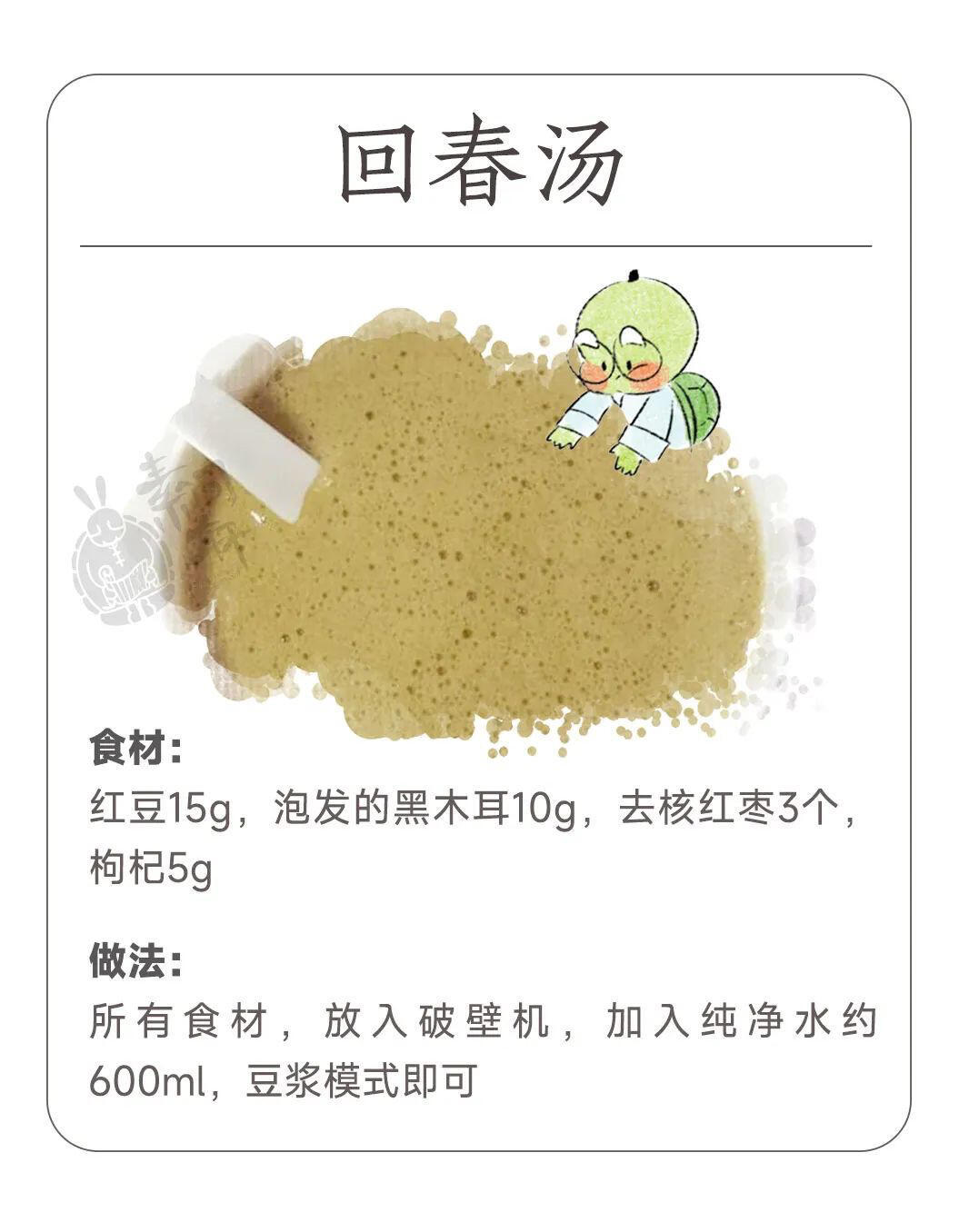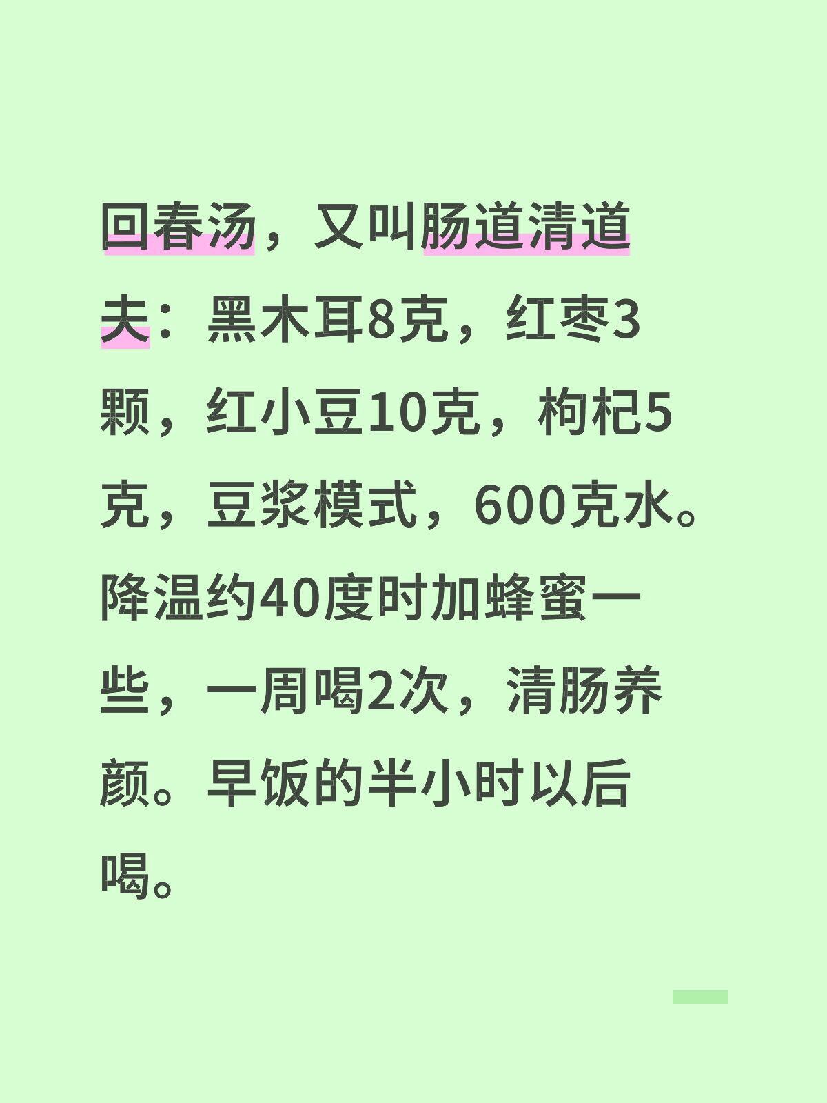 又虚又堵的人,就喝这碗回春汤!扫净全身淤滞回春汤,又叫肠道清道夫:黑木耳8克,红枣3颗,红小豆10克,枸杞5克,桂圆三颗,豆浆模式,600克水。降温约40度时加蜂蜜一些,一周喝2次,清肠养颜。早饭的半小时以后喝。