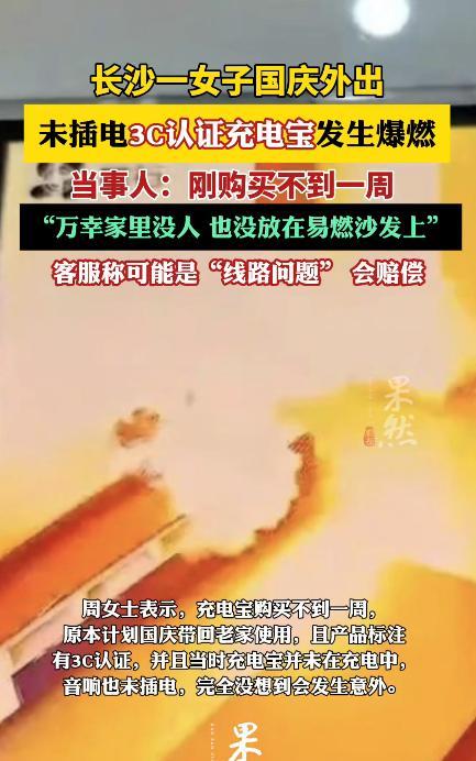 意外还是发生了!10月1日,湖南长沙,一女子外出时,将新买的“3C”认证充电宝放在音响上,结果到了晚上,充电宝突然爆炸!当时,充电宝并未充电,而且音响也没有通电,女子庆幸没有随身携带。网友:还有什么是安全的? 国庆小长假已经开始,不少人都收拾好行李外出旅游了,不过出门前,一定要好好检查一下家中的用电,将电闸、水闸关闭,门窗也都要关好。 据周女士介绍,这个充电宝是在网上的旗舰店购买的,上面有“3C”认证,买回来还不到一个星期,就是为了方便国庆期间充电才买的,没想到竟然出了这种事情! 当天晚上,周女士突然接到邻居打来的电话,称闻到了一股刺鼻的气味,挂断电话后,周女士立即翻看起家中的监控,结果发现下午4点左右,刚买来的充电宝发生了爆炸。 幸好她没有带在身上,也没有放在易燃的沙发上,不然后果不堪设想。 事后,周女士第一时间联系了客服,但因国庆假期的缘故,并没有人给她处理,直到第二天,才有客服回复了周女士,猜测应该是线路出了问题,目前双方正在协商相关赔偿。 此前,有新闻报道机场中有充电宝发生自燃,从那时开始,人们就开始选择正规的充电宝购买,没想到即使这样还是有意外发生。 信息来源:《长沙一女子国庆外出未插电3C认证充电宝发生爆燃》齐鲁壹点