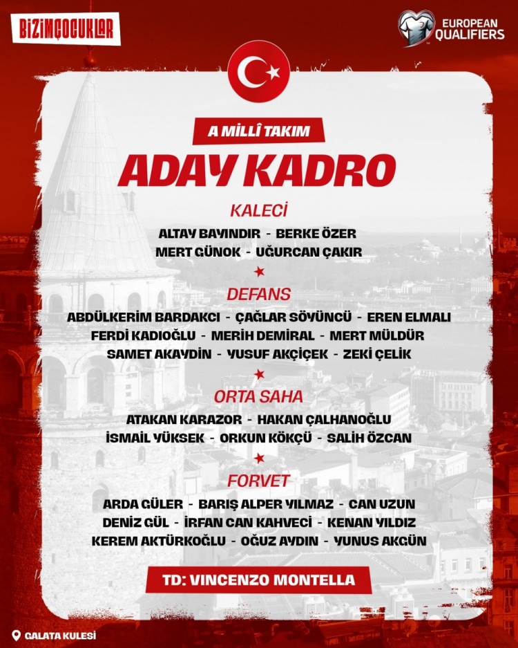 直播吧10月3日讯土耳其足协公布10月份世预赛名单,居勒尔、伊尔迪兹、恰尔汗奥卢在列,土耳其将在10月世预赛中对阵保加利亚、格鲁吉亚。